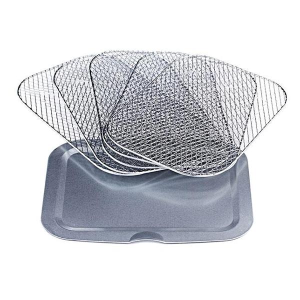 На электронном табло отображаются установленные параметры работы. В наборе поставляется пять поддонов из прочной нержавеющей стали, устойчивых к коррозии, действию пищевых кислот и щелочей. Приспособления можно устанавливать на пяти уровнях.