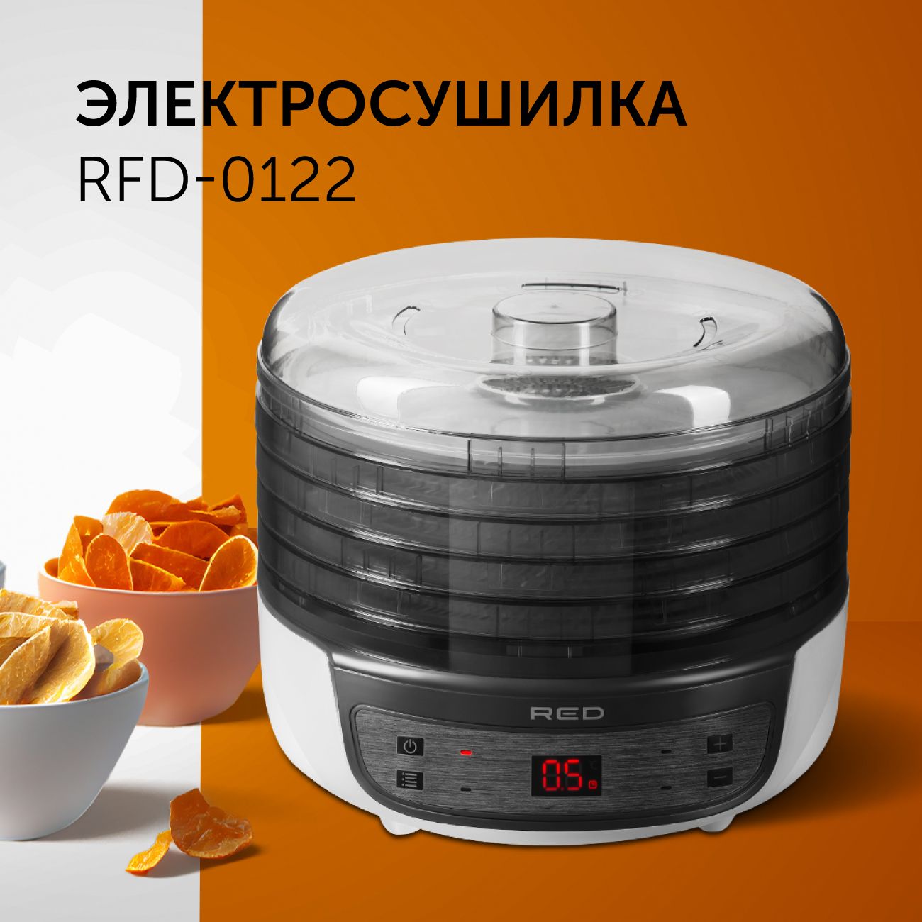 Сушка для фруктов Red Solution RFD-0122 оснащена сенсорной панелью управления. Кнопки используются для включения и выключения настройки температуры в диапазоне от 30°C до 70°C, времени обработки продуктов от 0,5 до 72 часов. Текущая информация отображается на цифровом дисплее. Вентилятор равномерно распределяет потоки воздуха внутри камеры.