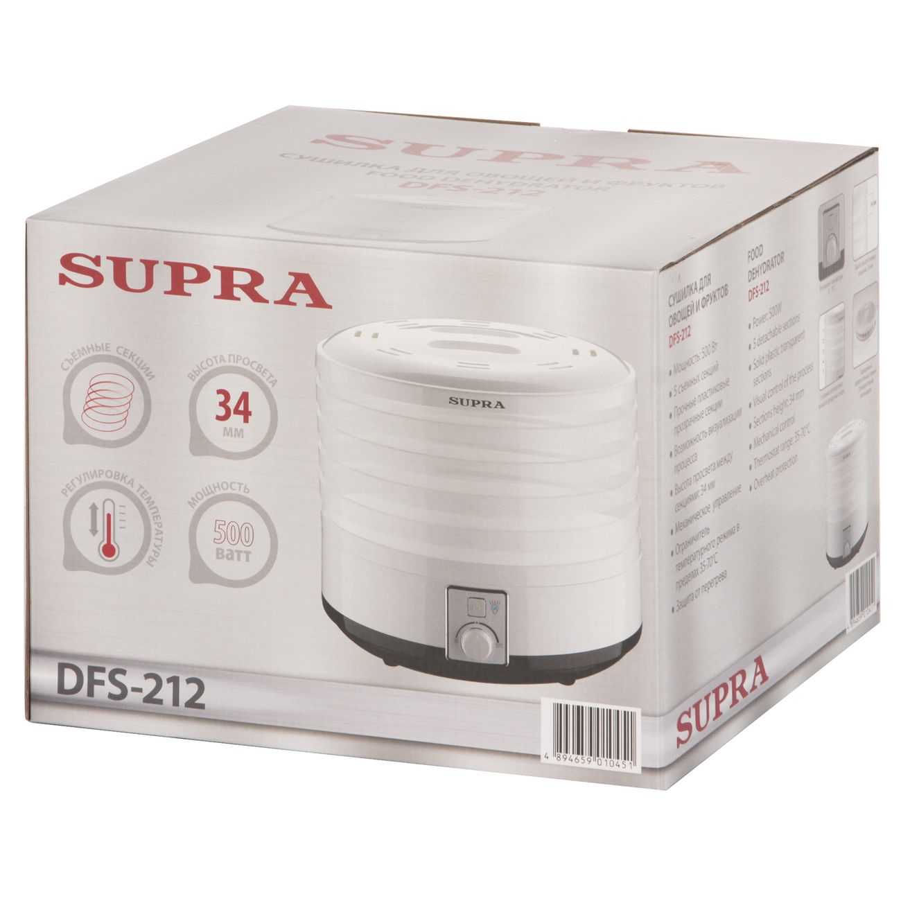 С помощью электросушки Supra DFS-212 запасти продукты, сохранив все их полезные свойства, не составит труда. Устройство снабжено пятью поддонами, в которых можно одновременно обрабатывать внушительный объём фруктов, ягод, грибов, лекарственных трав и другого. Также эта модель позволяет сушить рыбу, мясо и готовить пастилу.