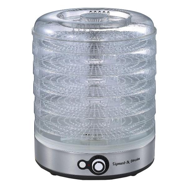 Сушилка для фруктов Zigmund & Shtain ZFD-406 серебристой расцветки работает от электросети и потребляет 500 Вт. Тип сушки — конвекционный. Корпус сделан из нержавеющей стали. Поддоны изготовлены из пищевого пластика, их пять штук. Прозрачная крышка позволяет контролировать процесс высушивания сырья.