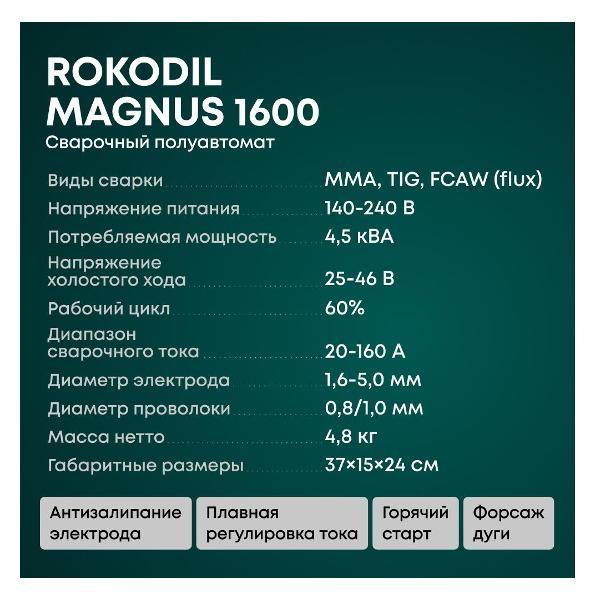 Вы можете купить Сварочный аппарат Rokodil Magnus 1600 в магазинах М.Видео по доступной цене. Сварочный аппарат Rokodil Magnus 1600: подробное описание, фото и отзывы реальных покупателей, характеристики, возможность скачать инструкции и подобрать аксессуары.