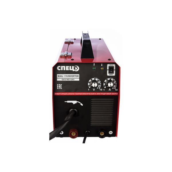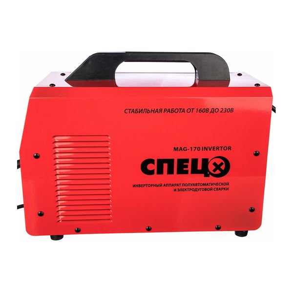 «Спец» MAG170 — инверторный аппарат, позволяющий сваривать металлические детали и изделия методом ММА и MAG. Для этого применяются электроды диаметров 1,6-4 мм. Металлический корпус обладает классом защиты от пыли и воды IP21S. В комплект входят кабели с горелкой, заземленный и с держателем, два сопла, щетка-молоток, защитная маска для оператора. Для переноски есть широкая ручка. Весит прибор — 9,8 кг.
