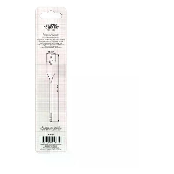 Сверло перовое Trigger 71054 с шестигр. хвостовиком 16 мм. Предназначено для создания отверстий в мягких материалах, преимущественно древесине, фанере, ДСП и ДВП. Высококачественная углеродистая сталь. Центрирующее острие, изогнутая геометрия режущих кромок и дополнительные боковые резцы для точного и производительного сверления. Шестигранный хвостовик 1/4" тип Е6,3. Наиболее удобен для использования с аккумуляторными дрелями и шуруповертами. Тип товара : Сверло перовоеСверло по дереву; Диаметр, мм : 16; Назначение : Дерево; Материал : Углеродистая сталь; Вес : 0,06