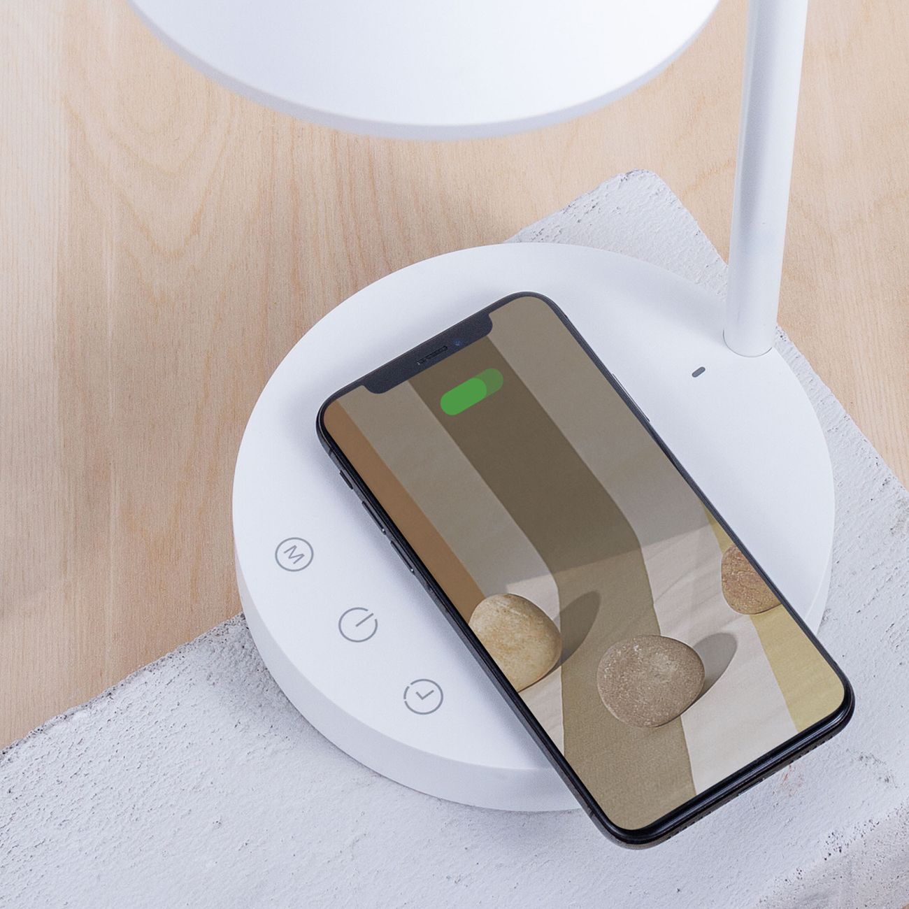 Светильник работает от обычной электросети. В комплекте есть оригинальный блок питания. Лампа оснащена беспроводным зарядным устройством. Вы сможете подпитывать на нём смартфоны, планшеты и мобильные гаджеты с функцией Qi.