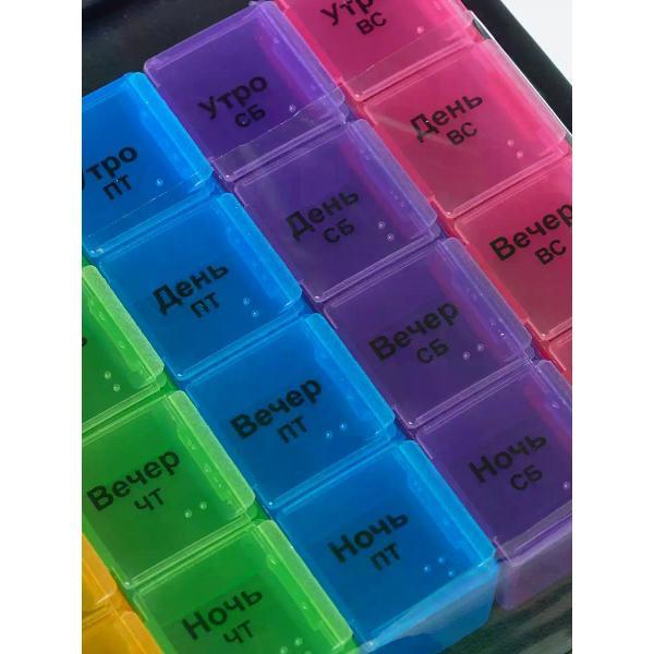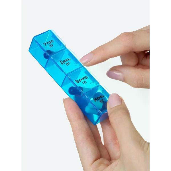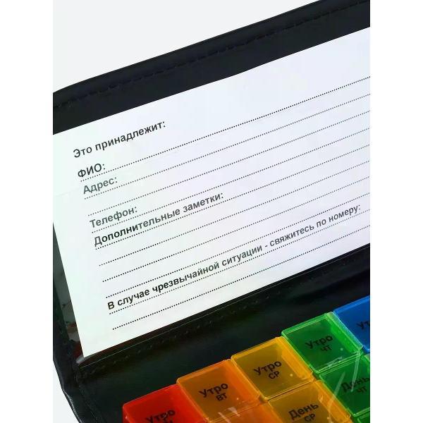 Таблетница предназначена для хранения лекарственных средств, таблеток и витаминов. Контейнер для таблеток - органайзер на неделю помогает контролировать прием препаратов. Эта таблетница - мечта для тех, кто постоянно забывает принимать нужные таблетки и витамины. Органайзер для лекарств разделен на ячейки не просто по дням недели, но и по времени суток. Таблетница на неделю выполнена из безопасного пластика, крышечки плотно закрываются, что препятствует случайному высыпанию содержимого. Таблетница органайзер на 7 дней легко поместится в дамской сумочке или кармане пиджака. Контейнер для таблеток позволит заготовить лекарства сразу на 7 дней. Размер контейнера: 19,5*12*3,5 см; Размер пенала: 10*2,3*2см. Вес: 180 грамм; Материал: полипропилен, кожзам.