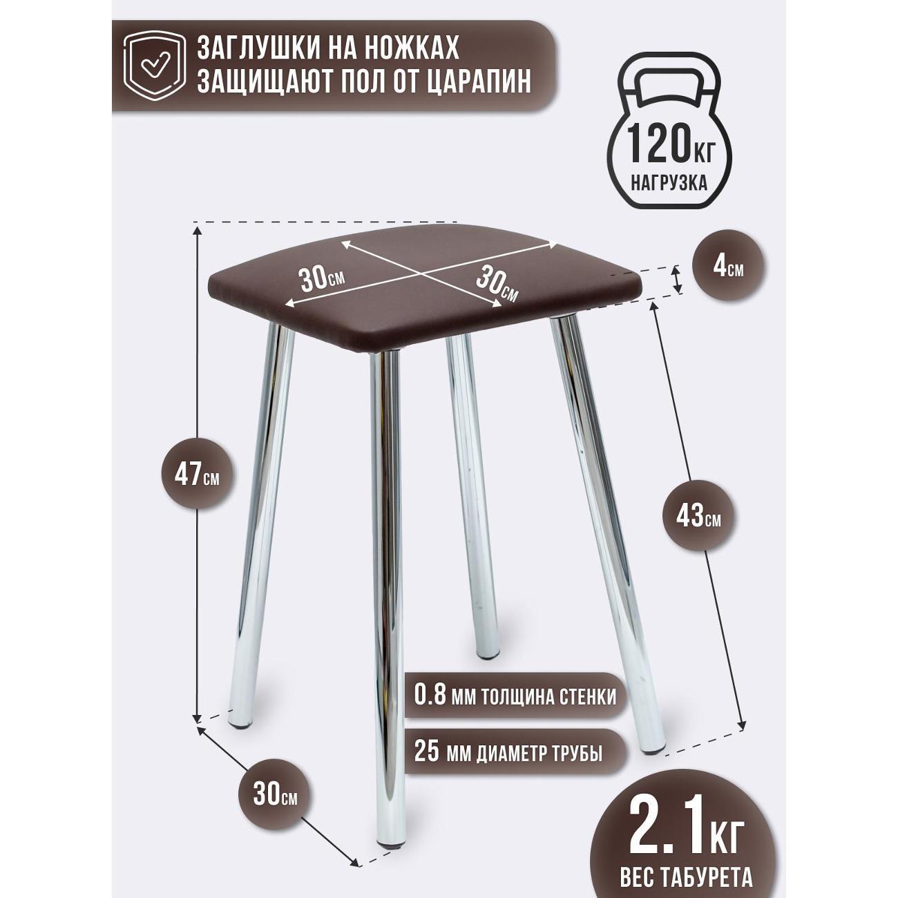 Набор включает два табурета. Изделия предназначены для использования в помещении. Сидушка каждого табурета имеет квадратную форму, размер 30х30 см. Высота табурета в сборе - 47 см. Ножки выполнены из металла с хромированным покрытием. На нижних концах ножек установлены пластиковые заглушки, которые предотвращают скольжение и защищают напольное покрытие от царапин. Сидушка обтянута экокожей. Материал устойчив к загрязнениям, легко очищается влажной тряпкой. Экокожа не впитывает запахи, что актуально для кухонной мебели. Для сборки табурета требуется вкрутить четыре ножки в подготовленные отверстия на нижней стороне сидушки. Благодаря четырем ножкам и квадратному основанию табурет устойчиво стоит на любой ровной поверхности. Рекомендуемая максимальная нагрузка - до 120 кг. Табуреты поставляются в разобранном виде в одной коробке. В упаковке находятся: две сидушки, восемь ножек, пластиковые заглушки (предварительно установлены на ножки). Модель подходит для ежедневного использования на кухне, для временной рассадки гостей, для использования на балконе, лоджии или даче.