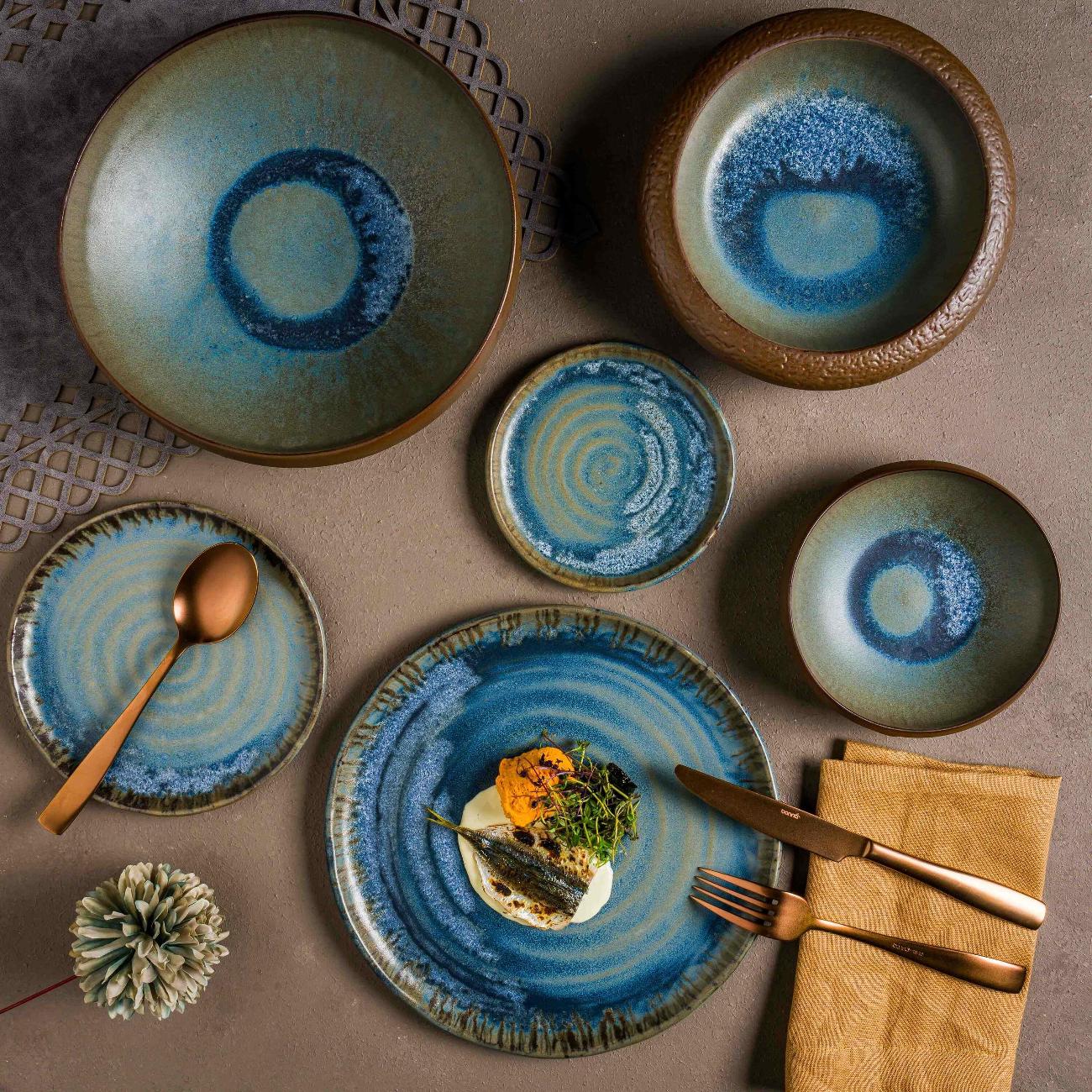 Коллекция Lagoon Ocean в своем увлекательном дизайне передает дух спокойного моря и течений, созданных волнами. Каждое изделие этой коллекции представляет собой уникальное сочетание глубокого синего и песочного тонов, напоминающее морские течения, кружащиеся на морском дне. Благодаря текстурированной матовой поверхности каждое изделие имеет вид ручной работы. Разнообразие форм и размеров коллекции позволяет проводить самые разные презентации: от камерных ужинов до грандиозных банкетов. Будь то изысканное блюдо из морепродуктов или сытное основное блюдо, коллекция Lagoon Ocean подчеркивает визуальную привлекательность любого блюда благодаря своим органичным и плавным узорам. Эта коллекция, идеально подходящая для заведений, стремящихся создать гармоничную атмосферу, превращает обед в отдых на пляже, делая каждый момент незабываемым.