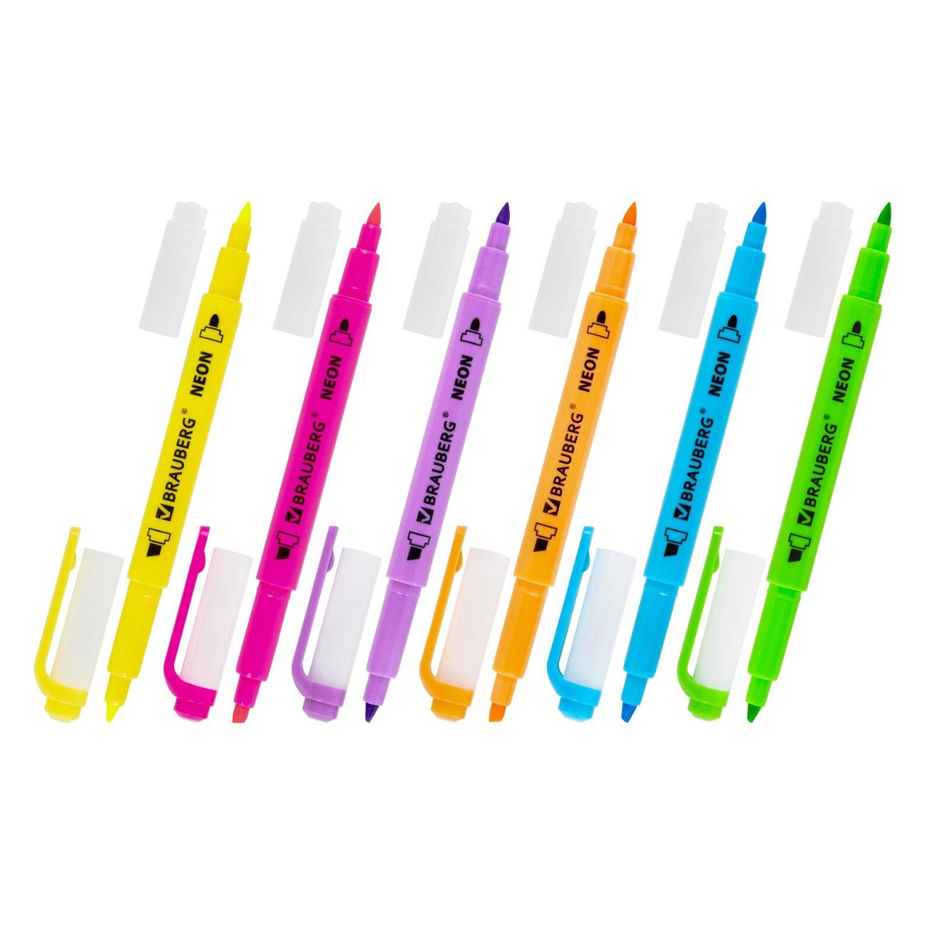 В наборе 6 двусторонних текстовыделителей неоновых цветов: розового, оранжевого, желтого, зеленого, голубого и фиолетового. Имеют корпус круглой формы диаметром 10 мм. К набору прилагается комплект наклеек для оформления текста и маркеров.