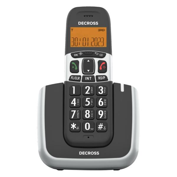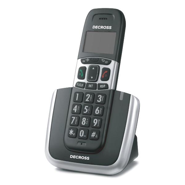 Телефон dect Decross DC1004 черного цвета обладает габаритами 15х5х5 см и массой 150 г. Спикерфон находится на трубке. Питание осуществляется от сети 220 В. Время работы в режиме разговора — до 10 часов, в режиме ожидания — до 120 часов. Предусмотрена возможность отключения микрофона. Устройство оснащается тональным и импульсным режимами работы. Возможно регулирование громкости звонка.