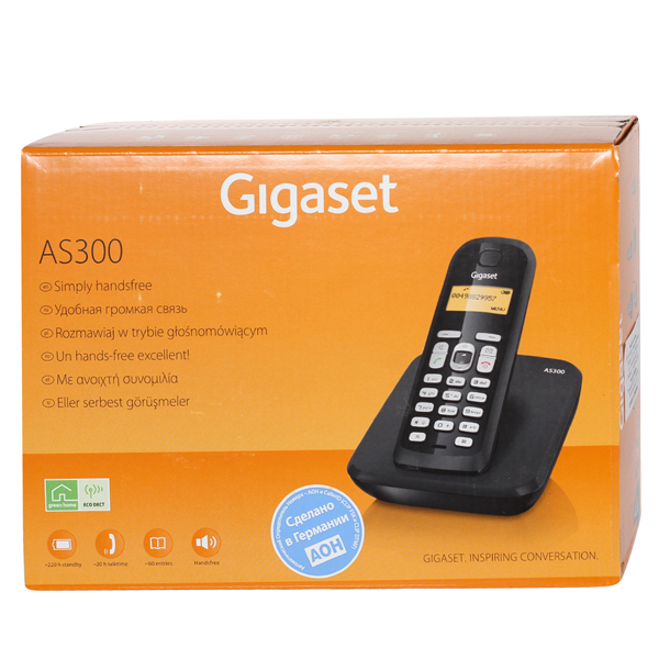 Gigaset AS300 — это простой беспроводной телефон со всеми необходимыми функциями, в частности функцией громкой связи. Причем благодаря технологии HSP™ качество звука будет безупречным независимо от того, используете ли вы трубку или громкую связь. Данная модель отличается длительным временем работы без подзарядки (до 20 и 220 часов режимах разговора и ожидания, соответственно) и позволяет подключить до четырех трубок. Кроме того, Gigaset AS300 отличается высокой экономичностью благодаря технологии ECO DECT1.