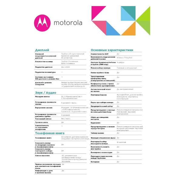 Телефон dect Motorola C1001LB+ черного цвета габаритами 17х5х7 см, весом 0,32 кг, функционирует от сети 220-240 В. Модель может работать в импульсном или тональном режиме автономно до 10 ч при разговоре и до 200 ч при ожидании, не требуя восстановления заряда. Собственная память дает возможность хранить до 50 номеров. К устройству можно подключать до пяти дополнительных трубок. Подсветка клавиш позволяет пользоваться изделием при любой освещенности. Можно регулировать громкость, отключать микрофон, использовать для звонка одну из предустановленных полифонических мелодий.