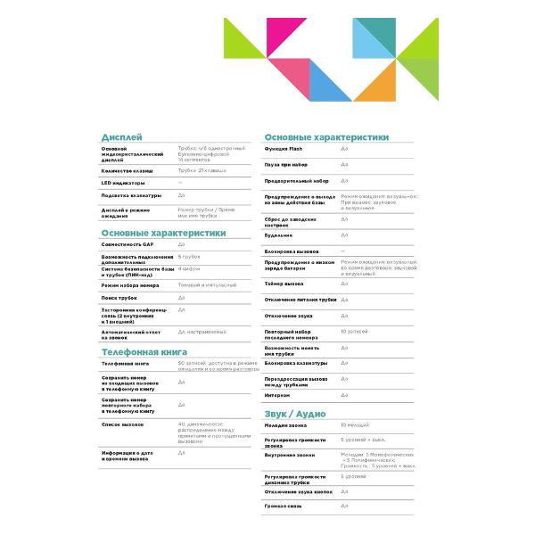 Время работы телефона в автономном режиме достигает 10 часов, в режиме ожидания — 200 часов. Присутствует функция отключения микрофона. На трубке размещается спикерфон. Прибор может работать как в тональном, так и в импульсном режиме.