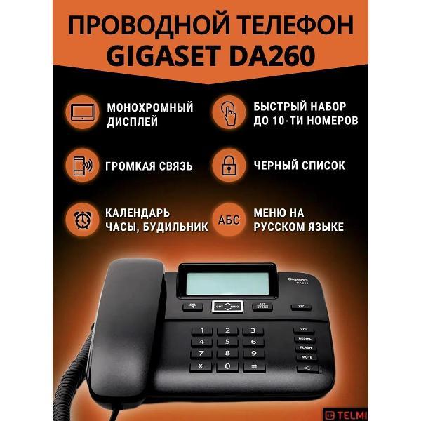Вы можете купить Телефон проводной Gigaset DA260 BLACK в магазинах М.Видео по доступной цене. Телефон проводной Gigaset DA260 BLACK: подробное описание, фото и отзывы реальных покупателей, характеристики, возможность скачать инструкции и подобрать аксессуары.