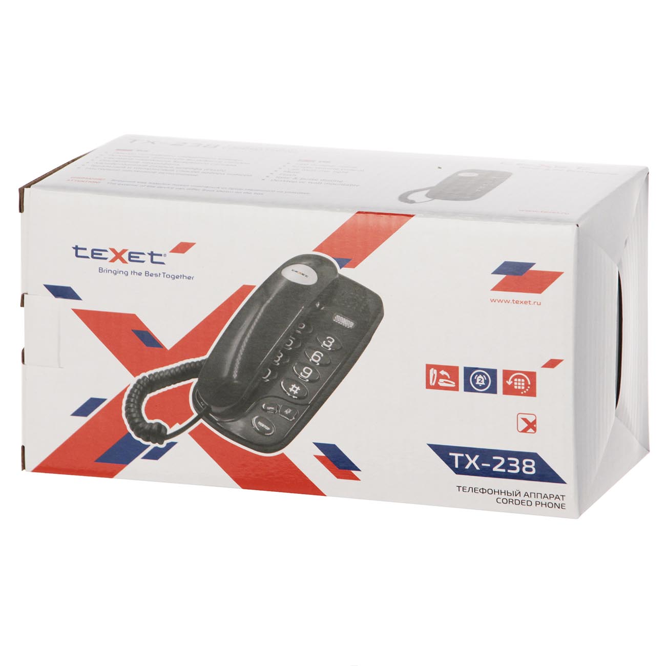 Проводной телефон teXet TX-238 можно устанавливать на столе. За счет компактных размеров он не займет много места, а для большей экономии пространства его можно закрепить на стене. Дополнительные функции этой модели: повторный вызов абонента, номер которого был набран последним, и регулируемая громкость сигнала.