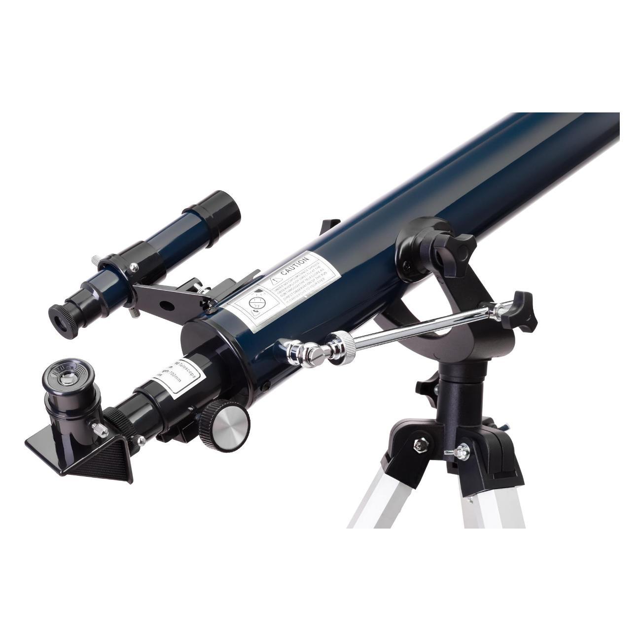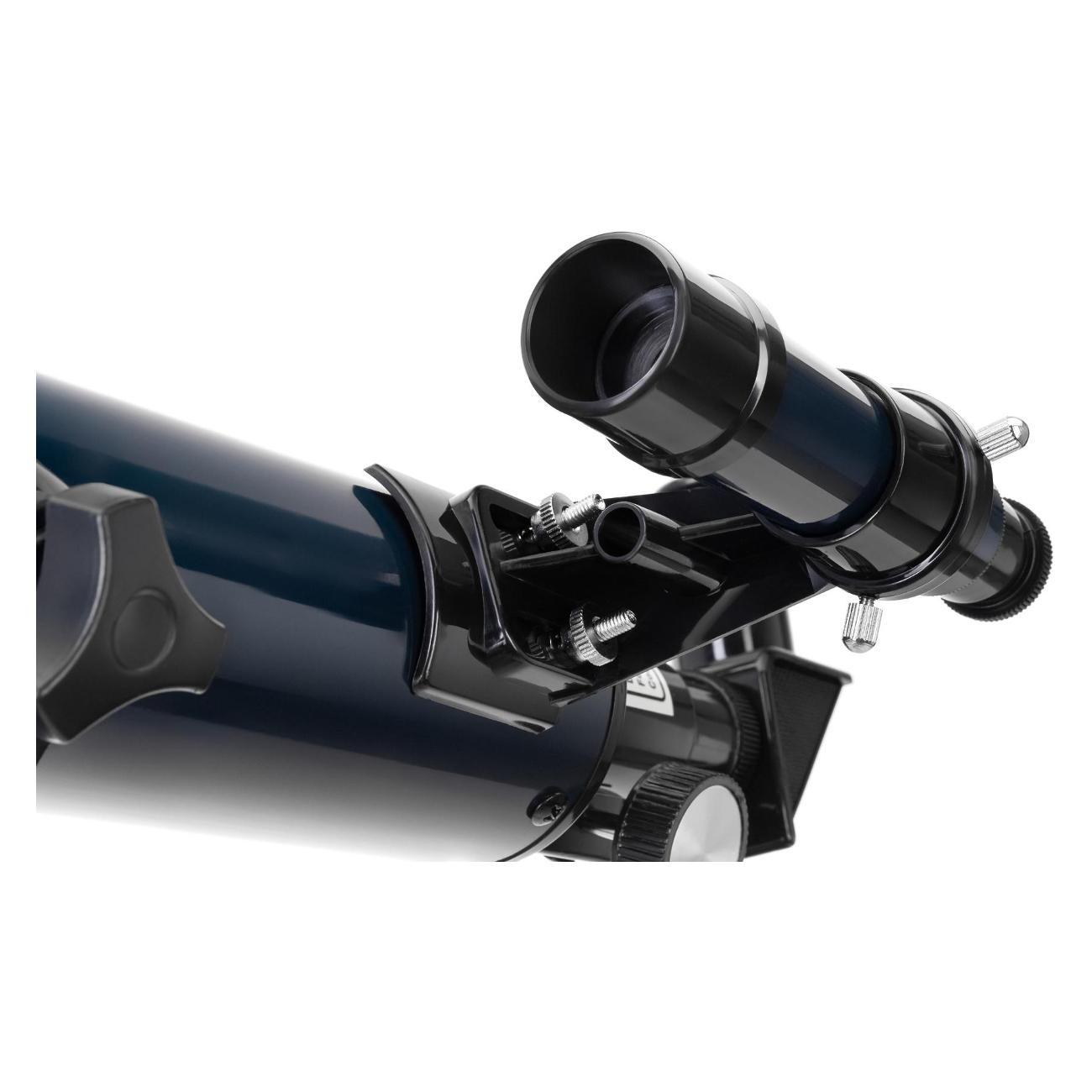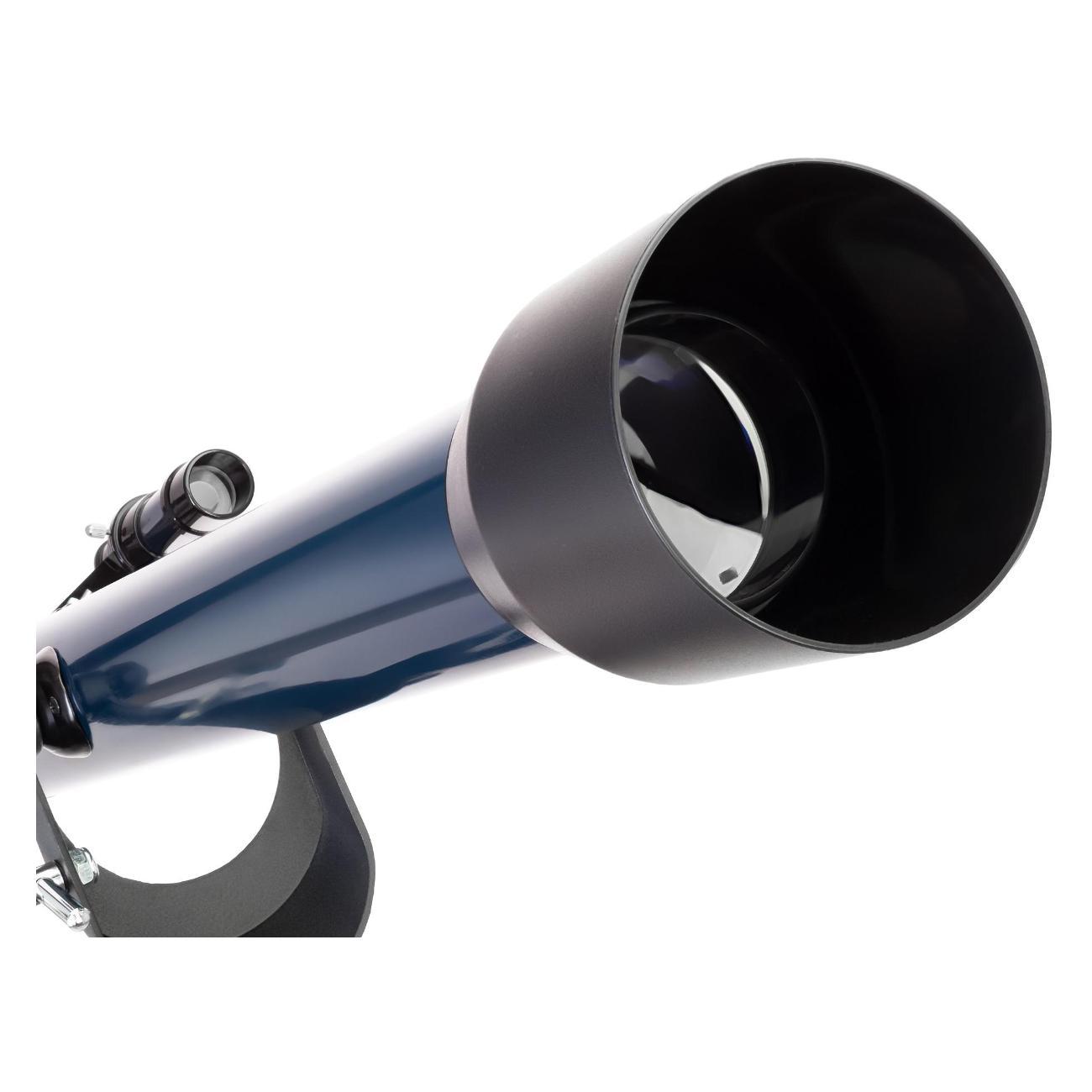 Оптическая схема – рефрактор, т. е. телескоп «заточен» на изучение ближнего космоса и наземные объекты. Лучше всего в него видна Луна, спутник нашей планеты. Благодаря разнофокусным окулярам и линзе Барлоу для наблюдений можно выбирать разные увеличения. А когда телескоп планируется использовать как зрительную трубу, рекомендуется применять диагональное зеркало и оборачивающий окуляр. Поиск объектов осуществляется при помощи оптического искателя.
