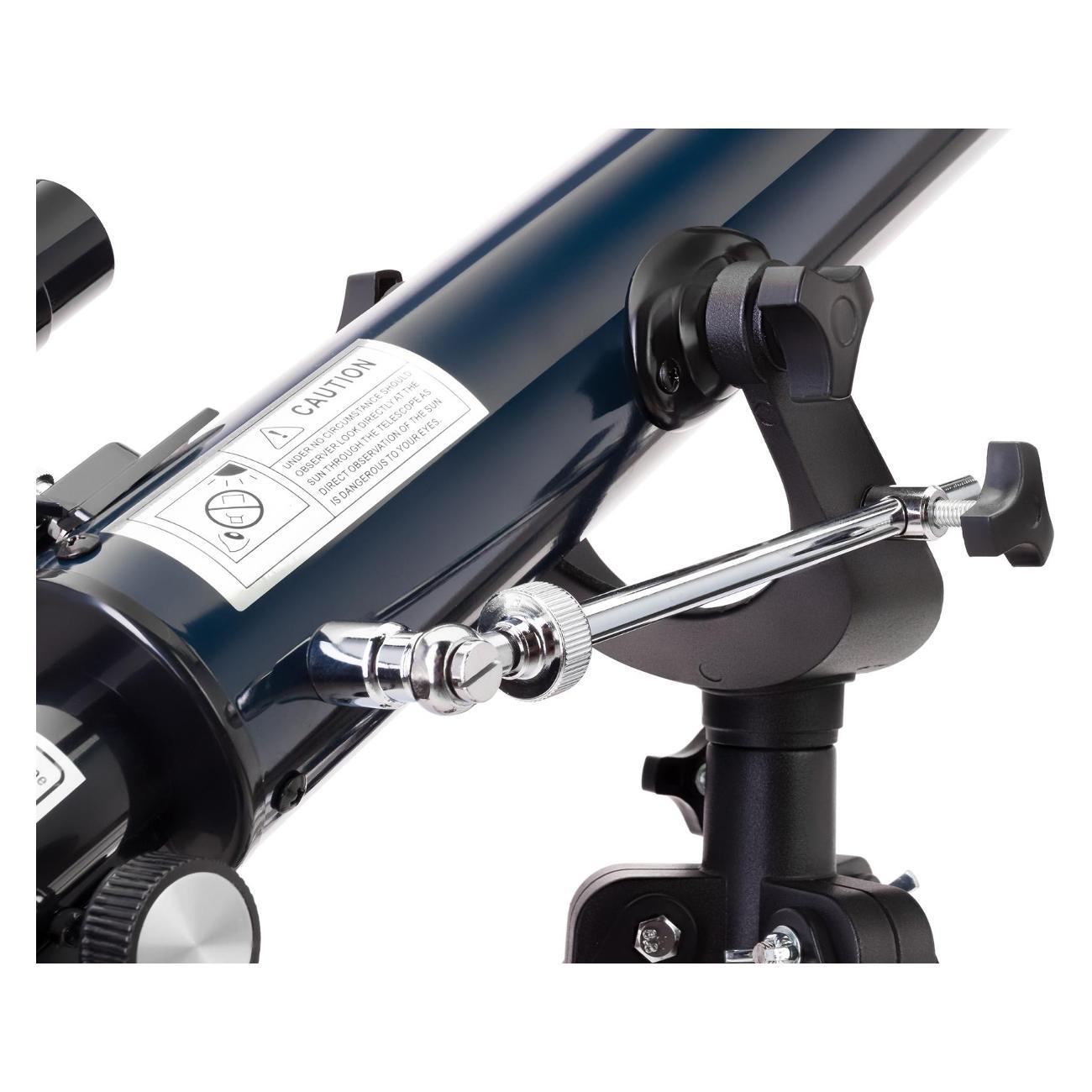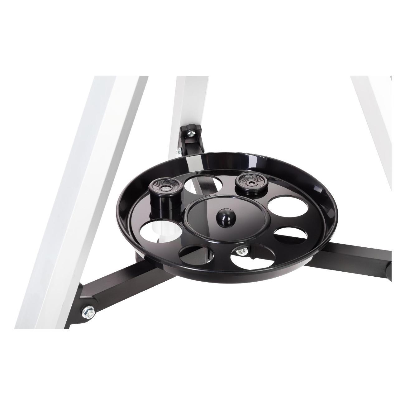 Оптическая труба установлена на азимутальную монтировку. Ее основной особенностью является наличие микровинта на вертикальной оси, благодаря которому наведение телескопа происходит более плавно и точно. Тренога сделана из алюминия, ее высоту можно регулировать, причем настройка производится для каждой ножки отдельно. Это удобно, так как позволяет телескопу стоять максимально устойчиво даже на неровной поверхности. В центре треноги предусмотрено место для лотка для аксессуаров.