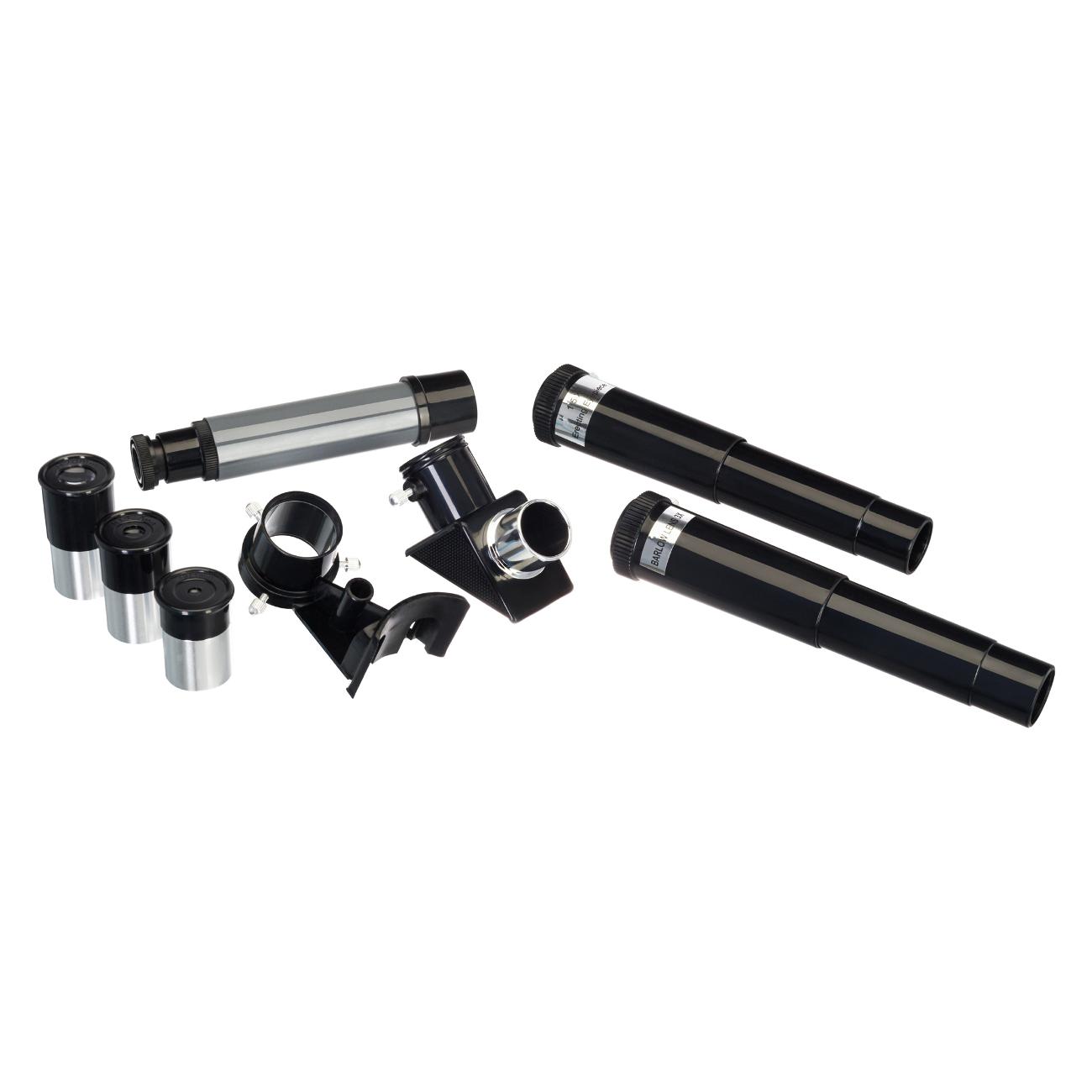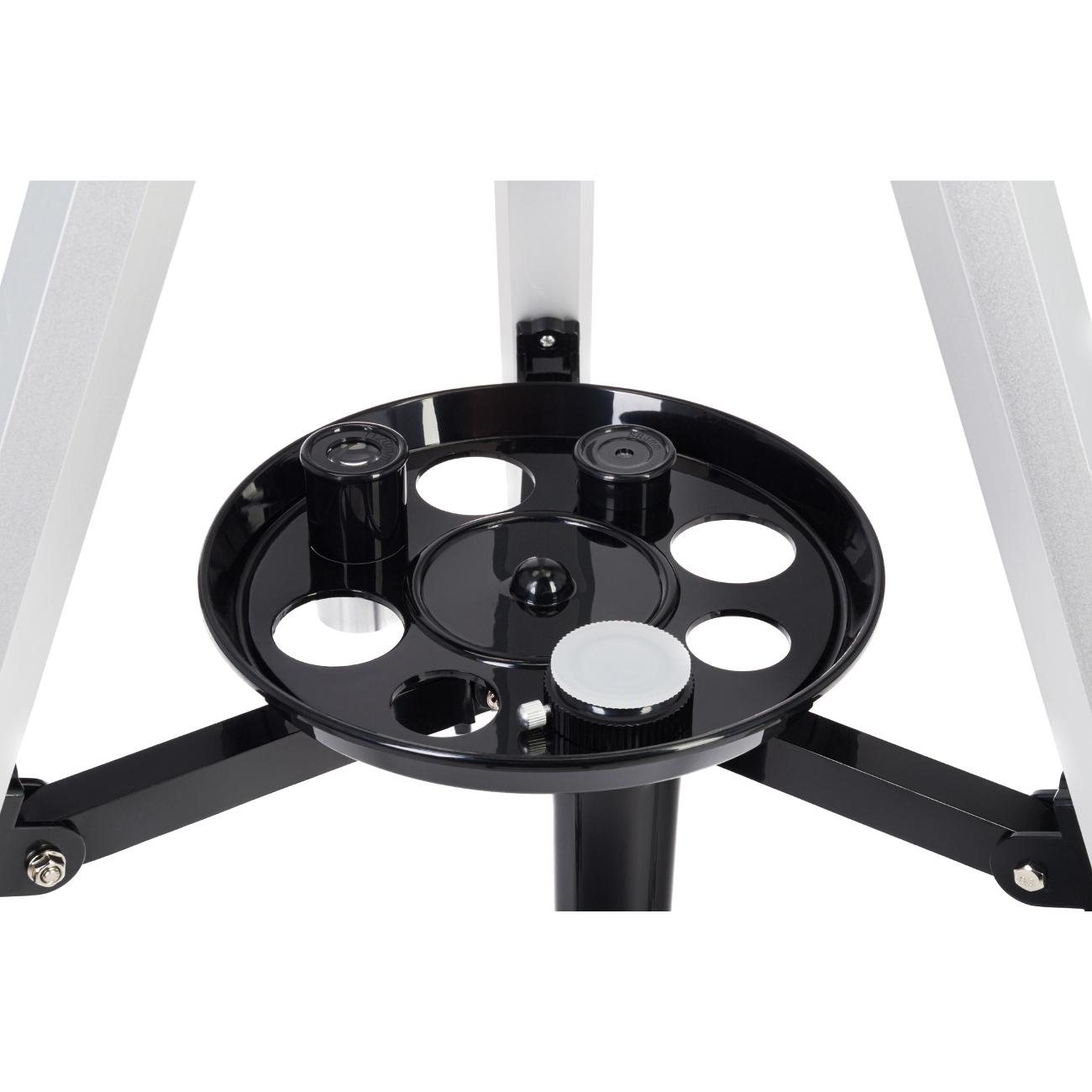 Телескоп комплектуется тремя окулярами (4 мм, 12,5 мм и 20 мм), линзой Барлоу с оборачивающей системой, диагональным зеркалом и оптическим искателем размером 5х24 мм. Прибор можно вращать по вертикальной и горизонтальной осям. В комплект входит тренога с возможностью изменения высоты и полочкой для небольших аксессуаров.