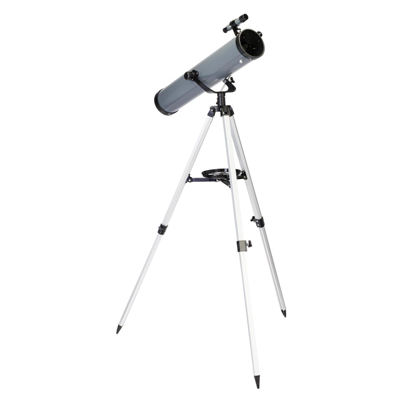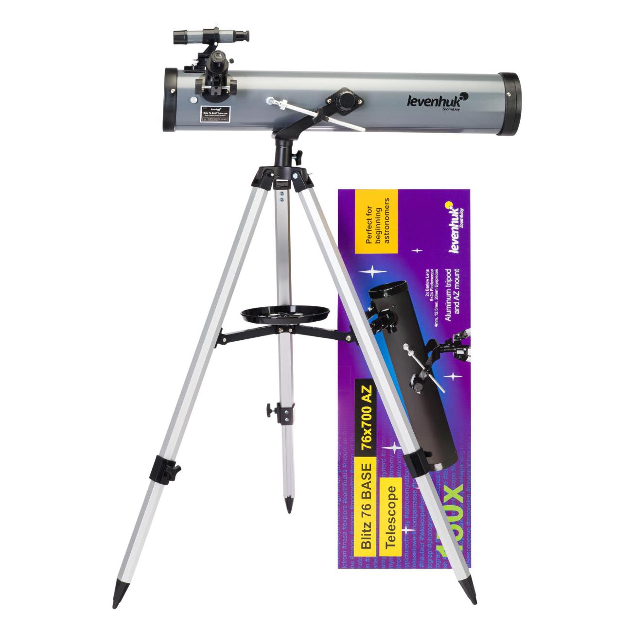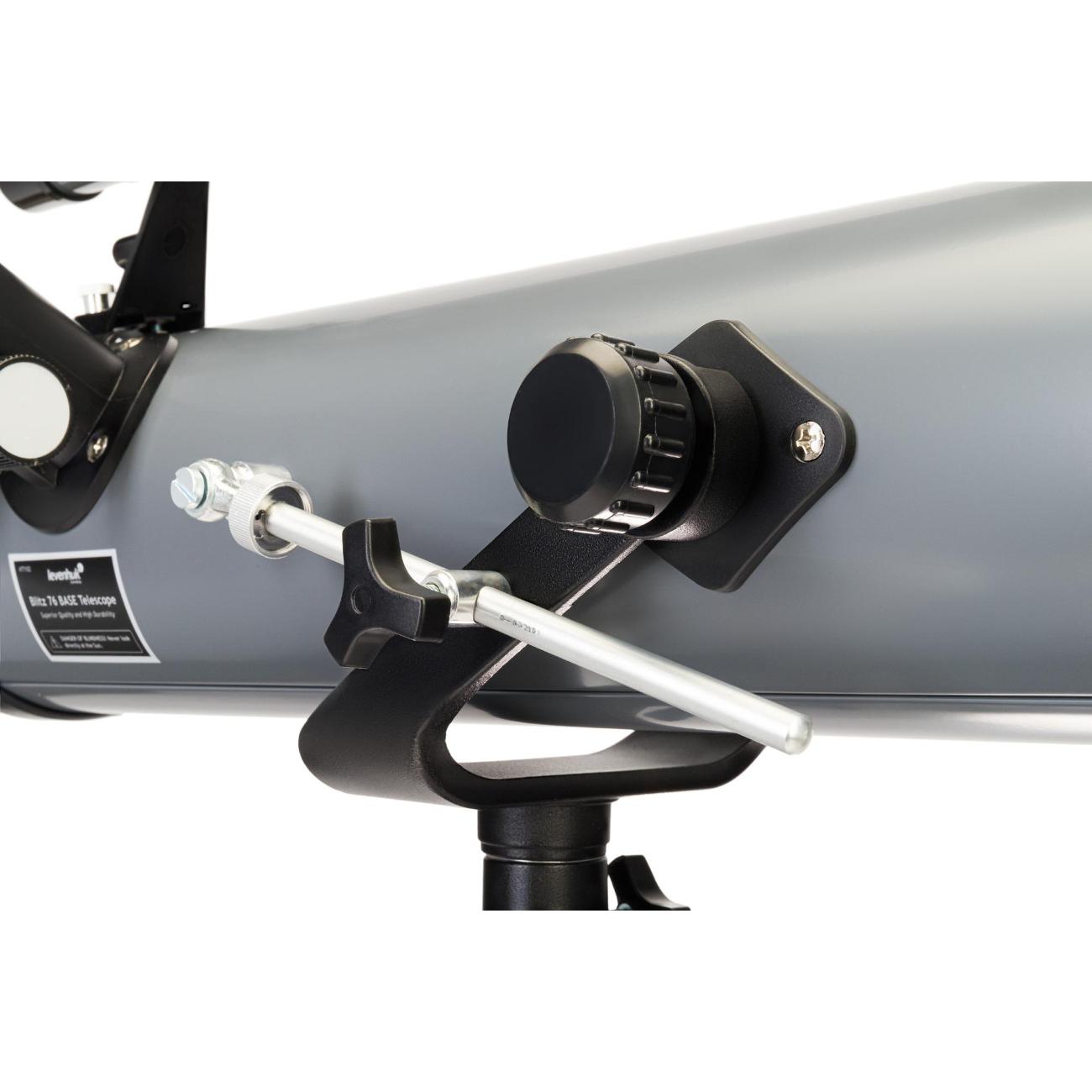 Телескоп Levenhuk Blitz 76 Base — удобное и простое в использовании устройство, подходящее как для новичков, так и для профессионалов. В нем используется оптическая схема «Ньютона». Может применяться для наблюдения за такими объектами, как туманности, галактики, звездные скопления. Установлен 76-миллиметровый объектив. Фокусное расстояние достигает 700 мм. Для большего удобства предусмотрена азимутальная монтировка. Специальный микровинт, расположенной на вертикальной оси, позволяет более точно наводить телескоп на изучаемый объект. Относительное отверстие равно 1:09. Предельная звездная величина соответствует значению 11,5 м.