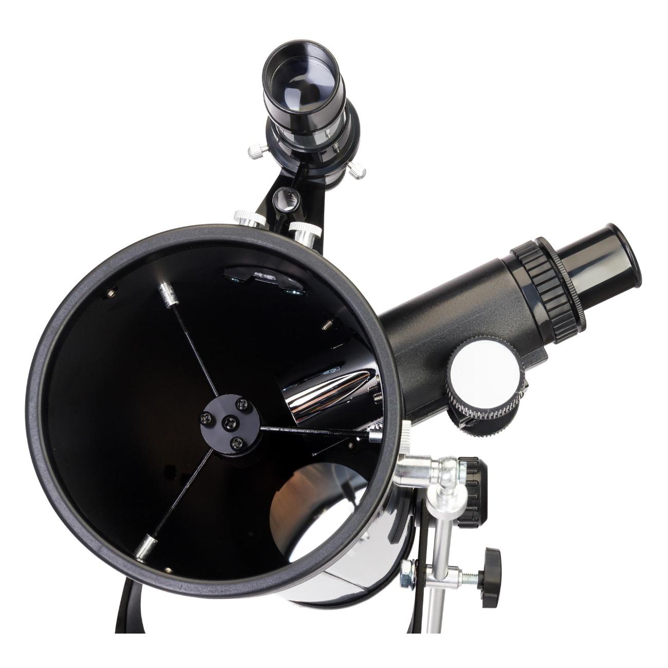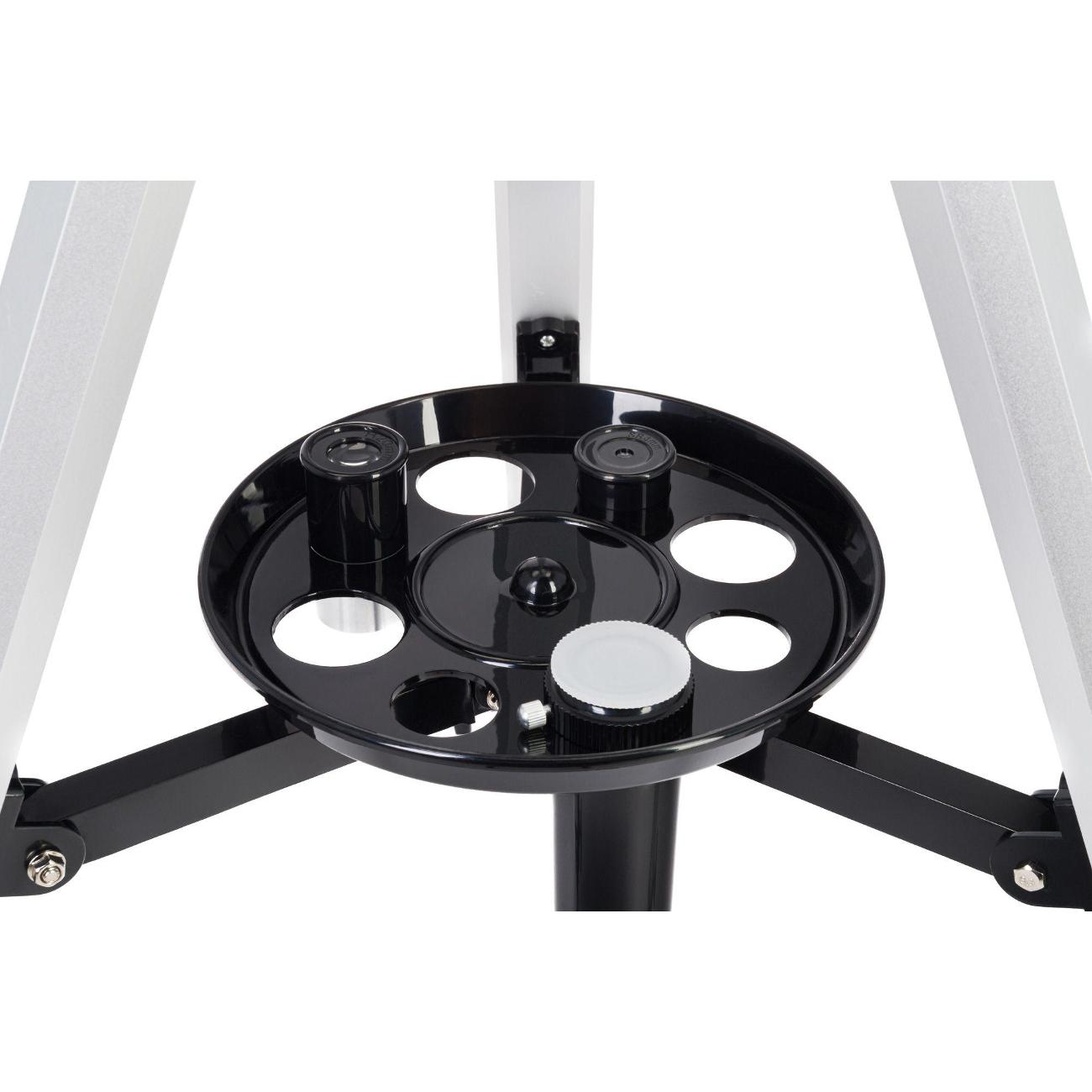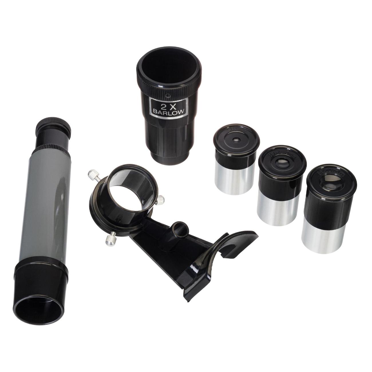 Оптика с антибликовым покрытием позволяет получать картинку высокого качества и четкости. Тренога изготовлена из алюминия, что делает ее одновременно прочной и легкой. Предусмотрена специальная полочка, куда можно сложить аксессуары. Высоту при необходимости можно отрегулировать. Модель оснащена широким набором окуляров для получения разного увеличения: 175х, 56х, 35х. Искатель, линза Барлоу (2х) и штатив входят в комплектацию. Габаритные размеры телескопа составляют 25,5х23х73,5 см.