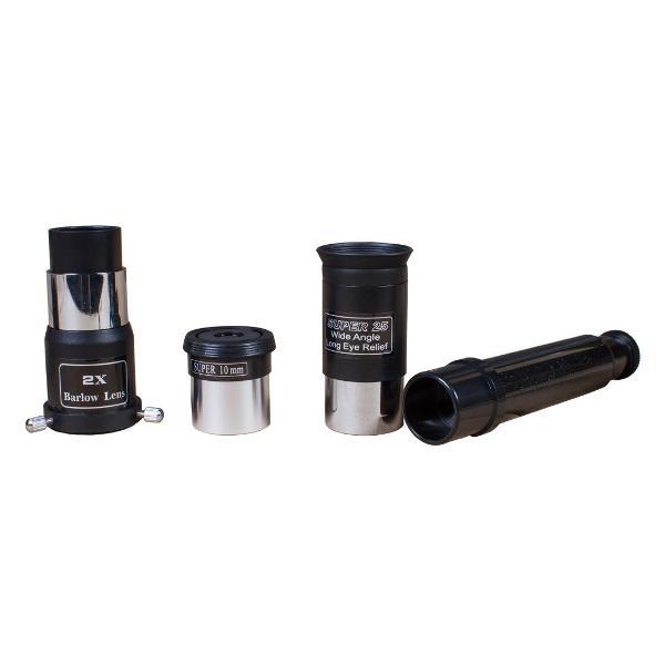 Зеркальный телескоп обеспечивает передачу яркой картинки, полностью свободной от хроматических аберраций. Максимального качества изображения можно добиться при загородных наблюдениях. Эта модель комплектуется двумя окулярами: 25 мм и 10 мм. Первый нужен для обзорных наблюдений и поиска объектов, а второй используется для изучения небесных тел при высоком увеличении.