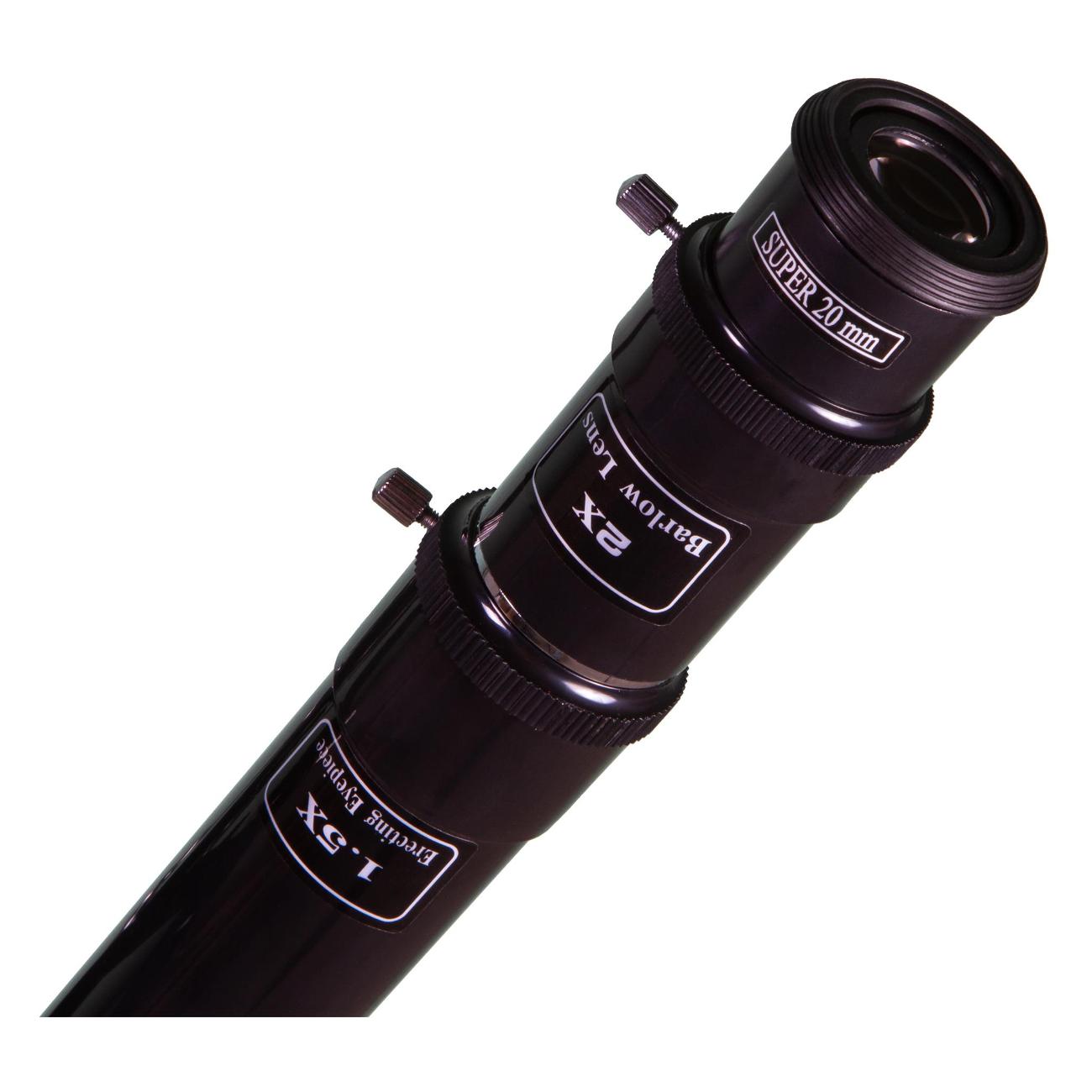 Альт-азимутальная монтировка дает возможность легко настраивать и перемещать телескоп. Модель зафиксирована на треноге из алюминия, регулирующейся по высоте. В центре штатива находится полка, на которую можно раскладывать все нужные для проведения наблюдений предметы. В комплект входят монтировка, искатель, два окуляра.