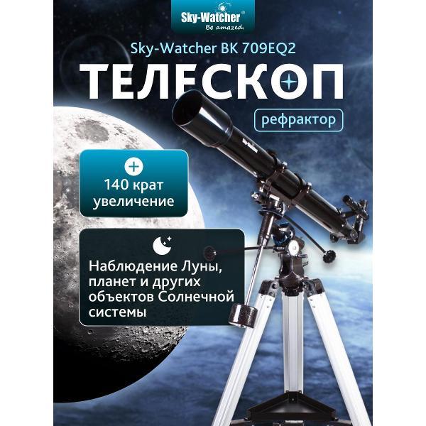Sky-Watcher BK 709EQ2 – рефрактор начального уровня на экваториальной монтировке EQ2. Оптические элементы просветлены, благодаря этому телескоп формирует яркое, четкое и контрастное изображение по всему полю зрения.