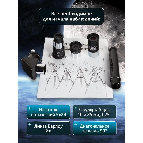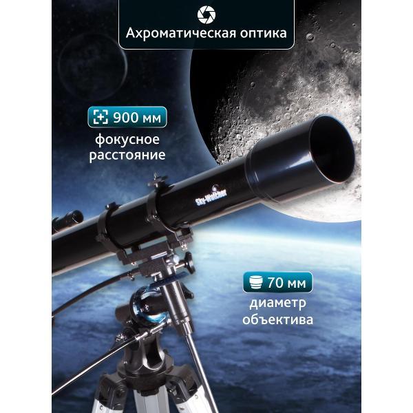 Телескоп оптимизирован для наблюдения объектов Солнечной системы. У него ахроматический объектив диаметром 70 миллиметров, хроматические аберрации сведены к минимуму, поэтому изображение резкое и с хорошей детализацией. Многослойное просветляющее покрытие оптики значительно увеличивает пропускание света.