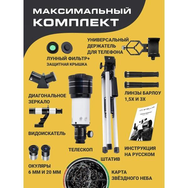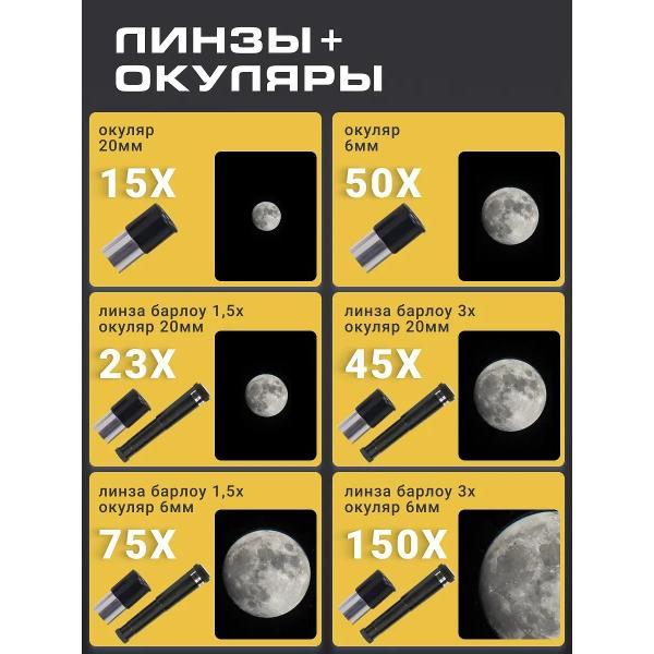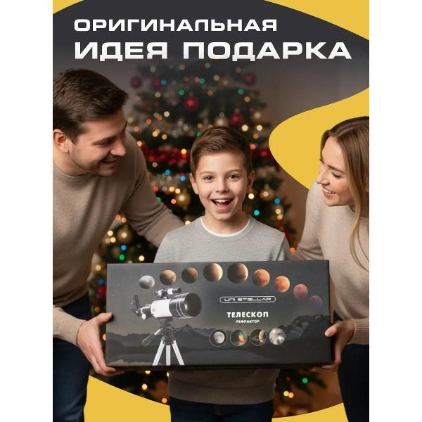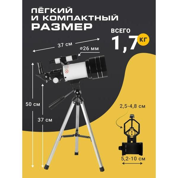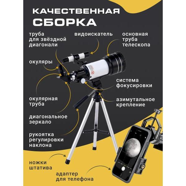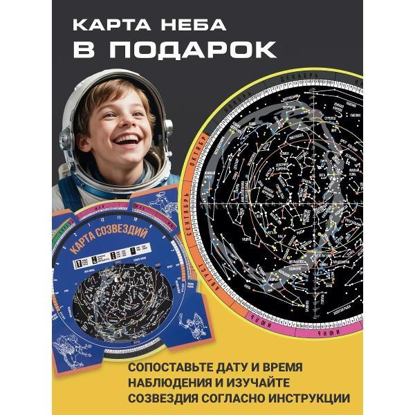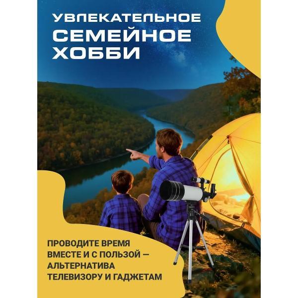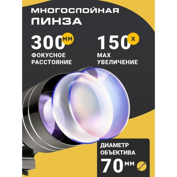 Профессиональный телескоп - рефрактор на азимутальной монтировке - надежный и качественный прибор для наблюдения за объектами звездного неба и Луной, лунной поверхностью и солнечной системой, млечным путем, космосом и планетами: Марсом, Сатурном и Юпитером, наземными объектами Земли с помощью настольного штатива - держателя - подставки. Монокуляр подходит для любознательных детей - школьников и взрослых - исследователей, которые любят наблюдать за светом звезд в ночи, изучать загадки Вселенной через мощный телеобъектив и призму объектива (диаметр телескопической линзы объектива 70 мм) с большого расстояния. Легкая и компактная портативная модель заменит игрушечный бинокль - телескоп прекрасно подходит на роль подзорной трубы: его можно взять с собой в путешествие и для изучения живой природы в рамках орнитологии с детства. Домашний зрительный прибор заменит поход в планетарий, ведь все необходимое для наблюдений за ночным небом можно разместить на домашнем столе или подоконнике. Телескоп - искатель с изображением высокого качества и надежным креплением, простым управлением создан для простых научных экспериментов, домашних исследований и познавательных опытов, для межгалактических приключений и детских космических игр. Классический прибор с четким кратным увеличением - полезная развивашка для первого знакомства с астрономией, развивающая и обучающая игрушка - электроника для начинающих юных астрономов. Набор включает: телескоп и аксессуары: тренога, зеркало с прямым углом, комплект удлинителей (в 1,5 раза и в 3 раза), основная труба, окуляры Н20 и Н6. В приборе использована инновационная технология покрытия линз Startron с максимальным полезным увеличением - 150 крат, максимальное фокусное расстояние - 300 мм. Карта звездного неба в подарок!