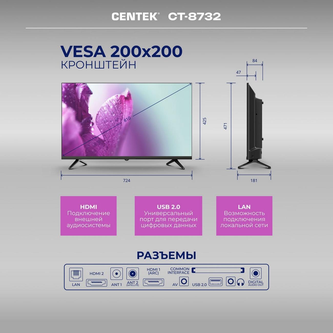 Вы можете купить Телевизор Centek 32CT-8732SMART в магазинах М.Видео по доступной цене. Телевизор Centek 32CT-8732SMART: подробное описание, фото и отзывы реальных покупателей, характеристики, возможность скачать инструкции и подобрать аксессуары.