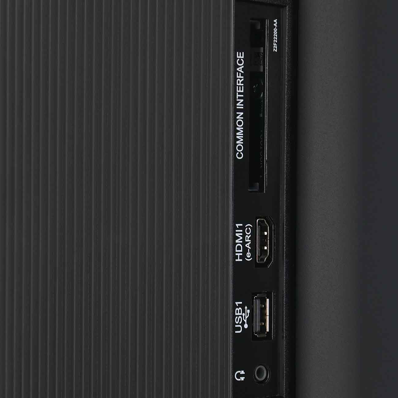 У телевизора два динамика мощностью 10 Вт каждый. Звуковая система Dolby Digital. На корпусе находятся HDMI-разъем, выход для наушников, два USB-порта, разъем для проводного интернета. Установлены модули Wi-Fi и Bluetooth. В комплектацию входят пульт и подставка.