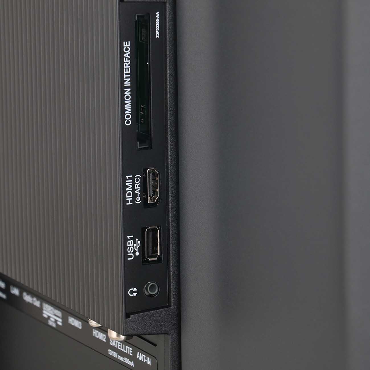 Акустическая система телевизора представлена двумя динамиками мощностью 20 Вт, с поддержкой цифрового многоканального звука Dolby Digital. Аналоговый и цифровой тюнеры открывают доступ к многочисленным телеканалам без подключения внешней антенны. На коммутационной панели предусмотрены разъемы RJ45, DVB Cam, HDMI 2,1 (три), mini jack, USB 2.0 Type А (два).