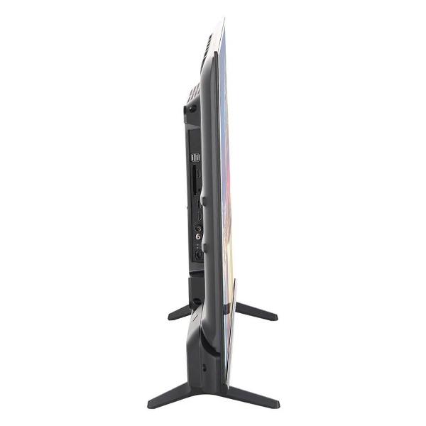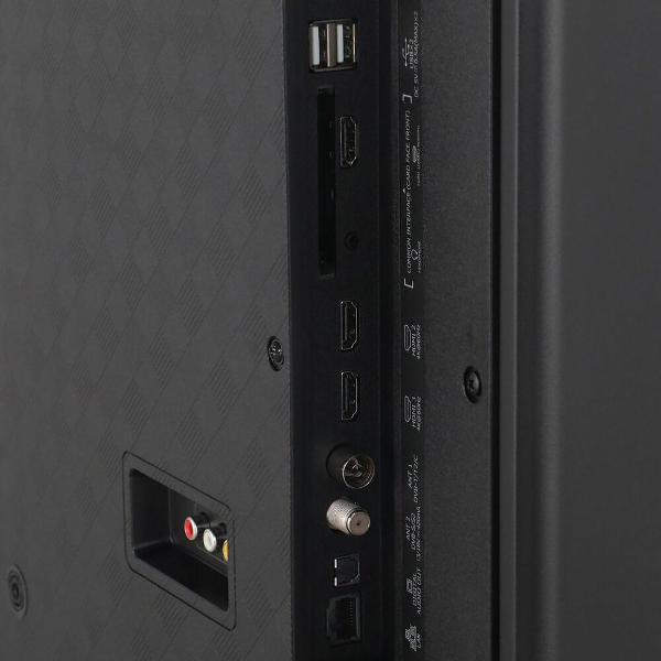 Для подключения задействуются интерфейсы Wi-Fi и Bluetooth, три входа HDMI, два порта USB 2.0 типа А, разъемы LAN, для модуля DVB CAM и для наушников 3,5 мм. Прибор работает от электросети, потребляя 75 Вт. Модель с креплением VESA 200х300 монтируется настенным или настольным способами. В комплектацию входит подставка, с учетом которой параметры равны 60,8х96,3х22,2 см и 6,9 кг. Без опор изделие с габаритами 56х96,3х7,4 см весит 6,8 кг.