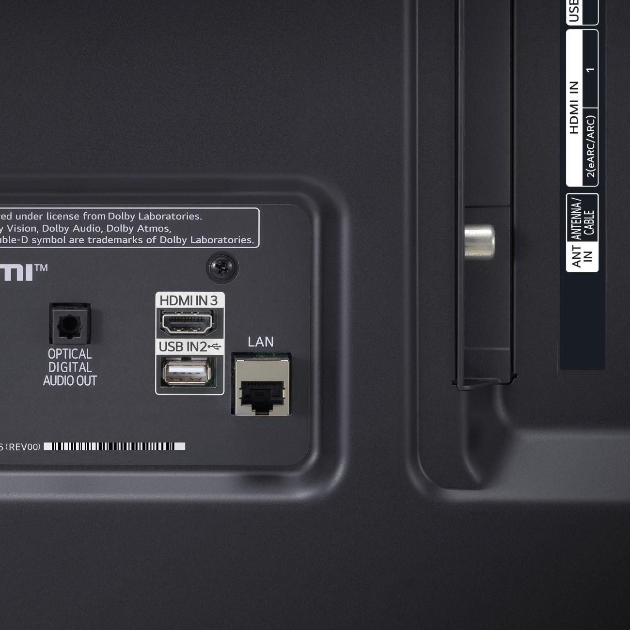 Для подсоединения дополнительного оборудования в корпус интегрированы три входа HDMI, два порта USB Type-A, разъемы для наушников и приставки, оптический выход Toslink. Предусмотрен интерфейс для кабельного подключения к интернету, через модуль Wi-Fi можно выйти в сеть без проводов. Телевизор размещается на горизонтальной поверхности с помощью подставки из комплекта или на стене (крепление VESA 400х400 приобретается отдельно).