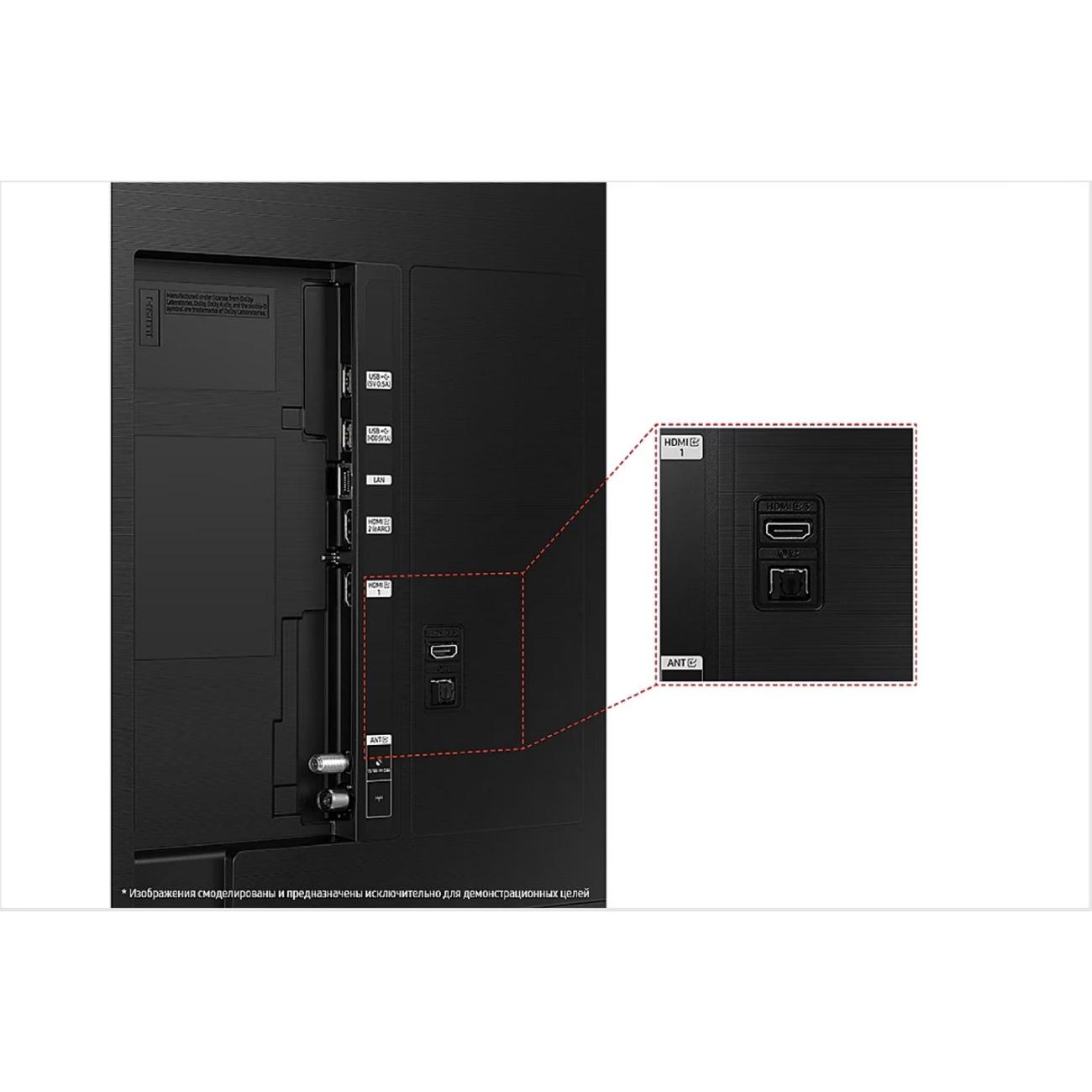 Акустическая система телевизора состоит двух стереодинамиков мощностью 20 Вт с поддержкой технологий Dolby Digital Plus, повышающих точность и глубину воспроизведения звуков. Цифровое и аналоговое телевещание, слот для карт Cl+ с зашифрованным контентом обеспечивают трансляцию передач без подключения внешней антенны. На коммутационной панели установлены интерфейсы HDMI (три), USB 2.0 тип A (два), LAN, DVB CAM, антенный вход. Для управления функциями предусмотрен кнопочный пульт, голосовой помощник, мобильное приложение SmartThings.