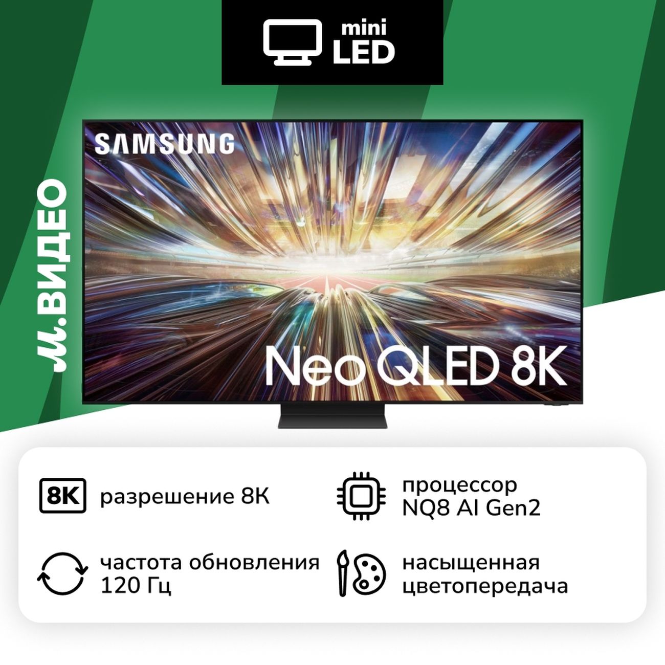 Телевизор Samsung QE65QN800DUXRU работает на базе предустановленной ОС Tizen. На 65-дюймовый экран выводится сочная картинка с разрешением 7680 на 4320 пикселей. Изображение подвергается цифровым шумоподавлением для уменьшения искажений. Частота обновления составляет 120 Гц, что уменьшает вероятность возникновения разрыва кадров при показе динамичных сцен.