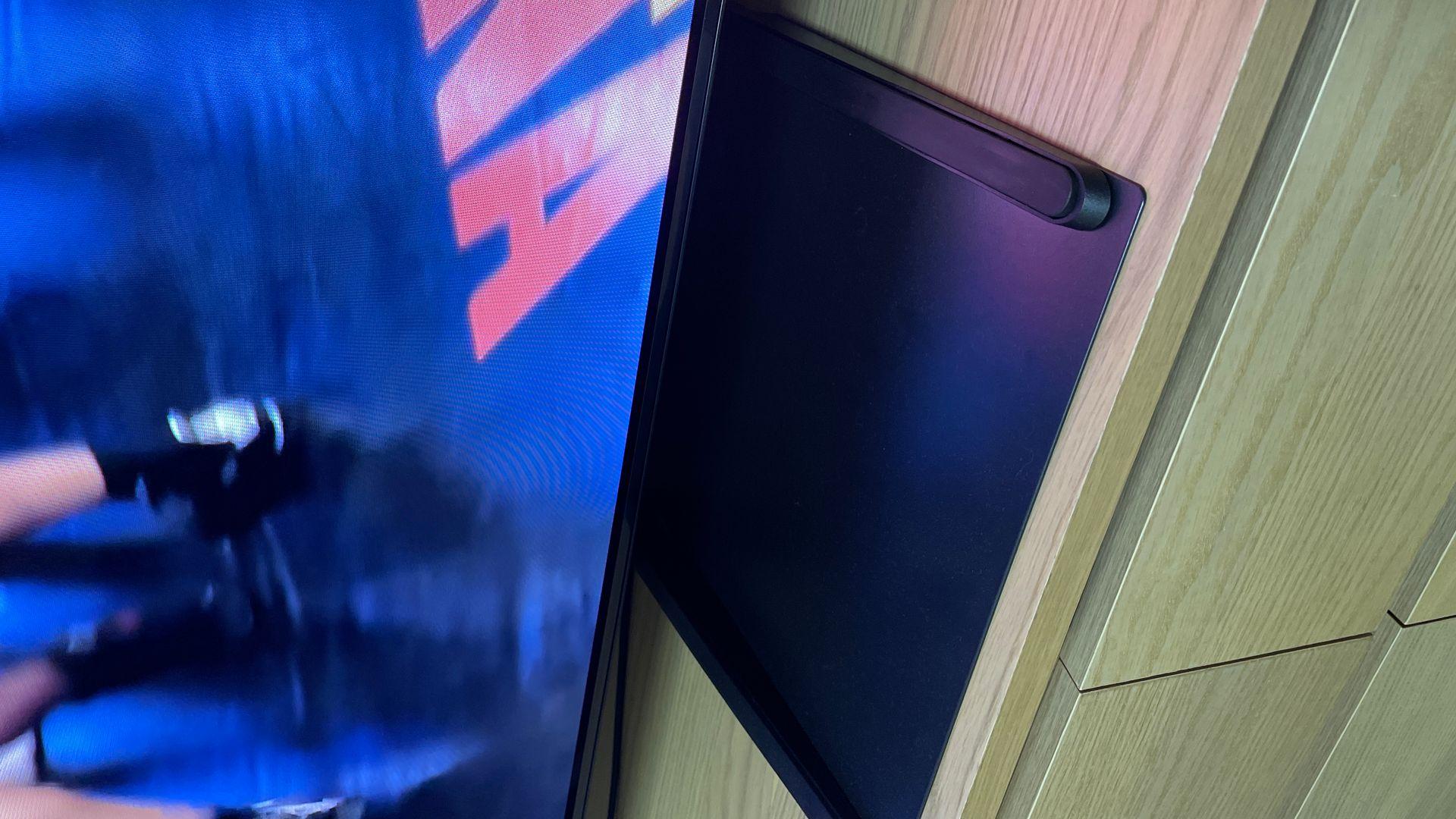Как оказалось, на 77 дюймах подставка совсем не такая как на меньших диагоналях - это не монолитная минималистичная пластина, а две ножки, которые вставляются в пластину, которая уже ставится на тумбу. Это конечно удешевляет телевизор и ни в одном обзоре я это не видел.