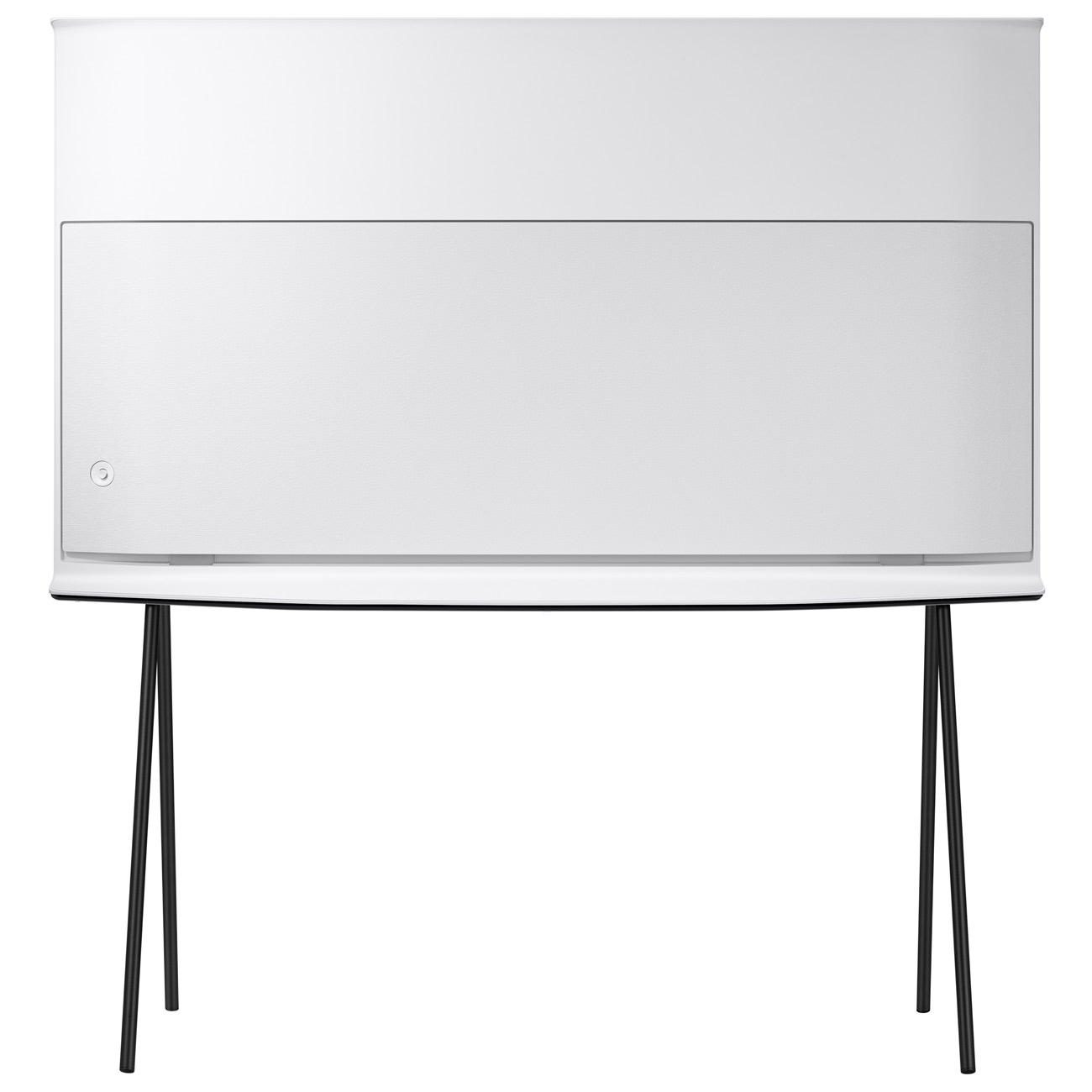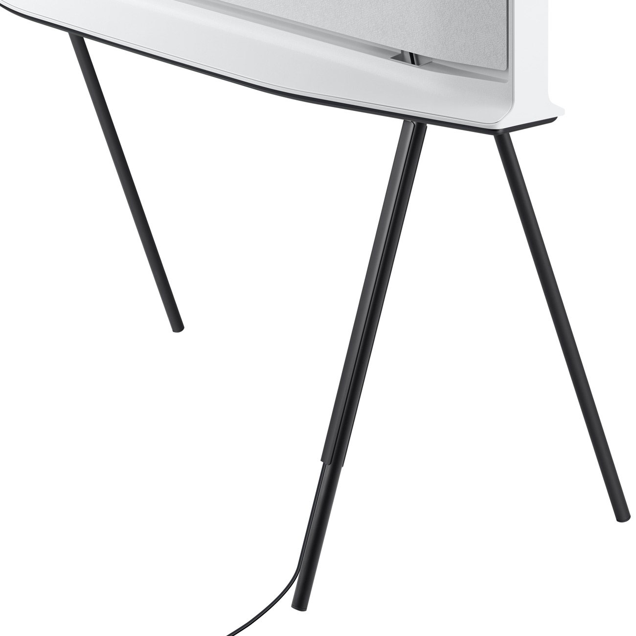 Samsung QE49LS01RAU серии The Serif – не просто телевизор, но и настоящее украшение современного интерьера. Эта модель отличается необычным дизайном: I-образный профиль привлекает к себе внимание и выглядит элегантно и стильно. Прибор может стоять как сам по себе, так и на оригинальной напольной подставке, которая входит в комплект. Надёжная опора сделана из металла, в одной из её ножек есть канал для кабеля.