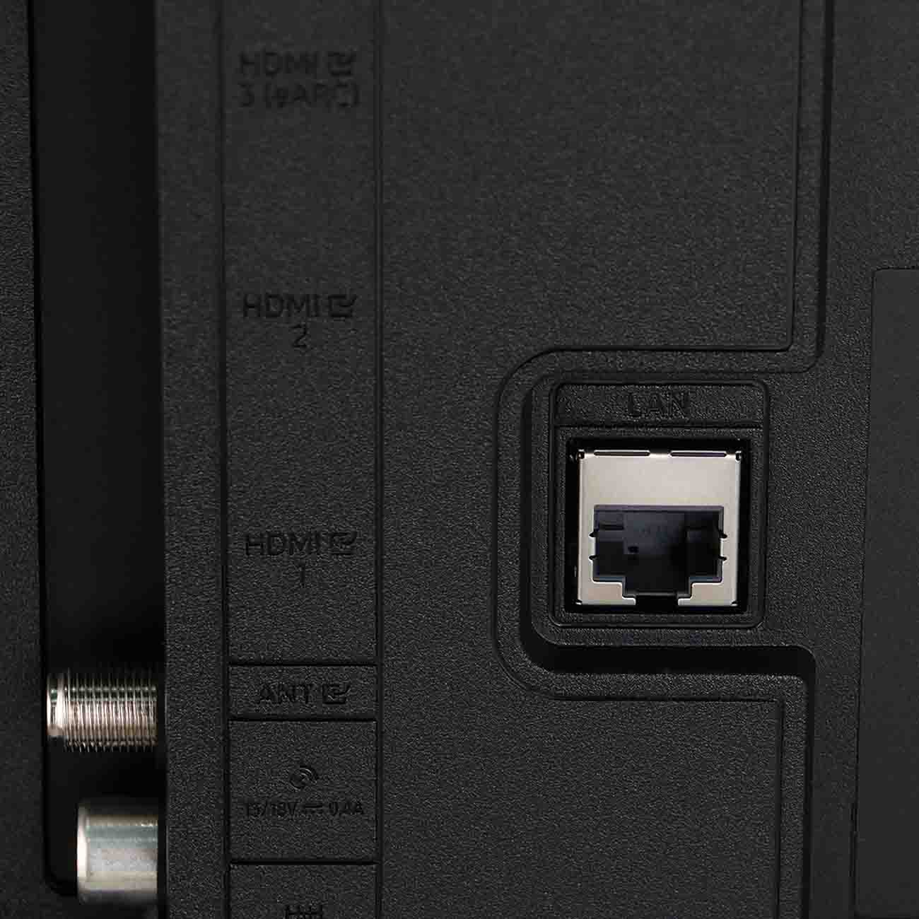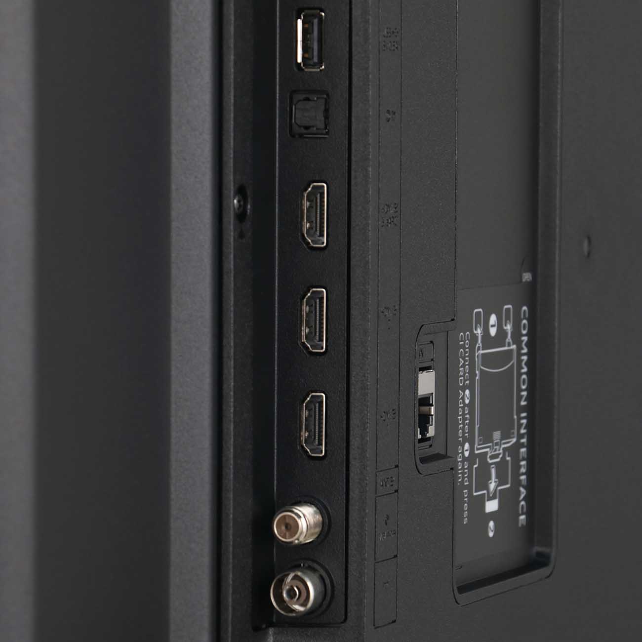 Подключение внешних устройств осуществляется через три HDMI-разъема, один USB-порт, порт для кабельного интернета, оптический выход для аудиоустройств, два антенных входа, CI-слот. В режиме ожидания телевизор потребляет 0,50 Вт электроэнергии, в режиме максимальной производительности — 150 Вт.