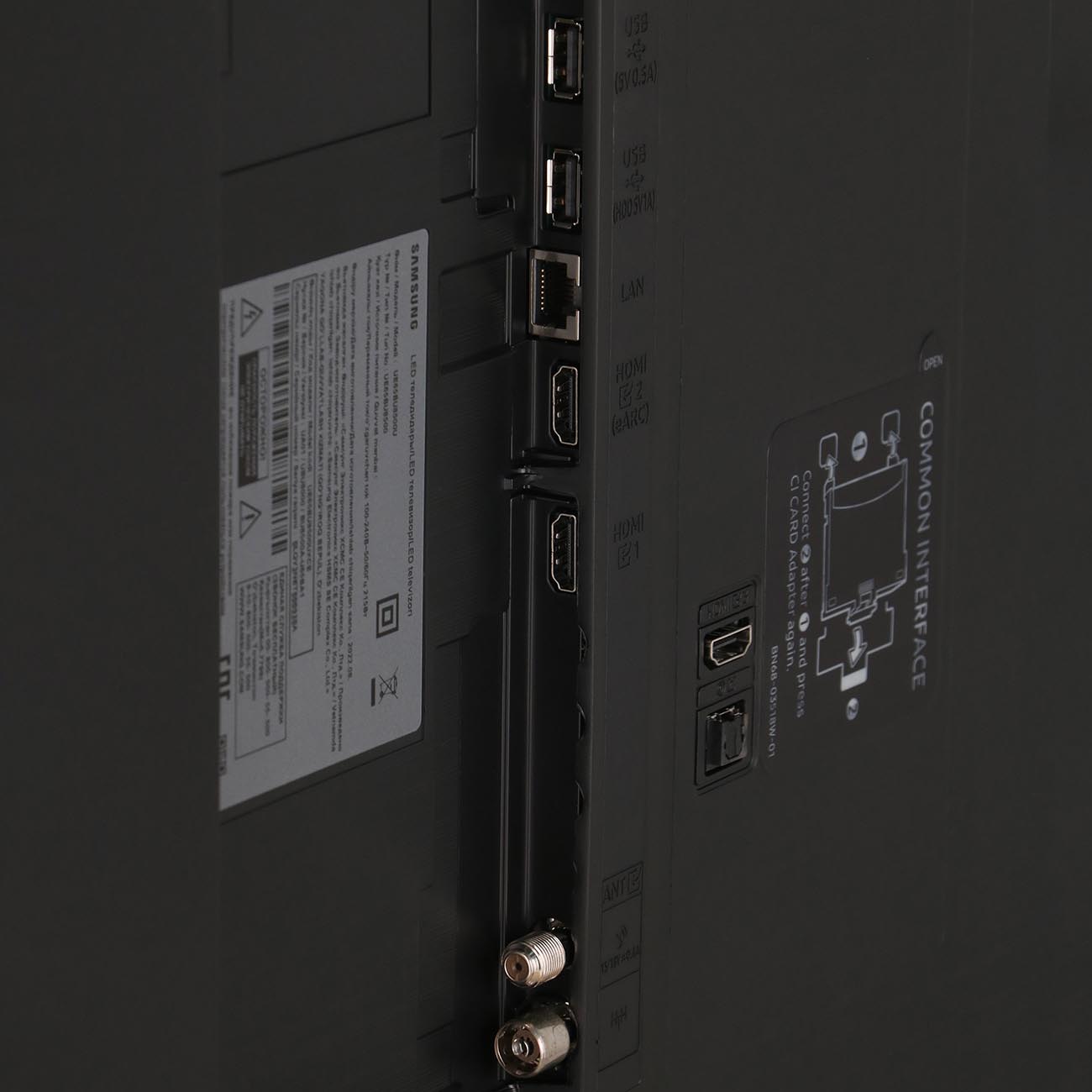 Для подключения используются три порта HDMI, два USB-разъема, оптический выход, два входа под антенное и кабельное телевидение, CI-порт, Bluetooth версии 5.2 и модуль беспроводного интернета Wi-Fi.