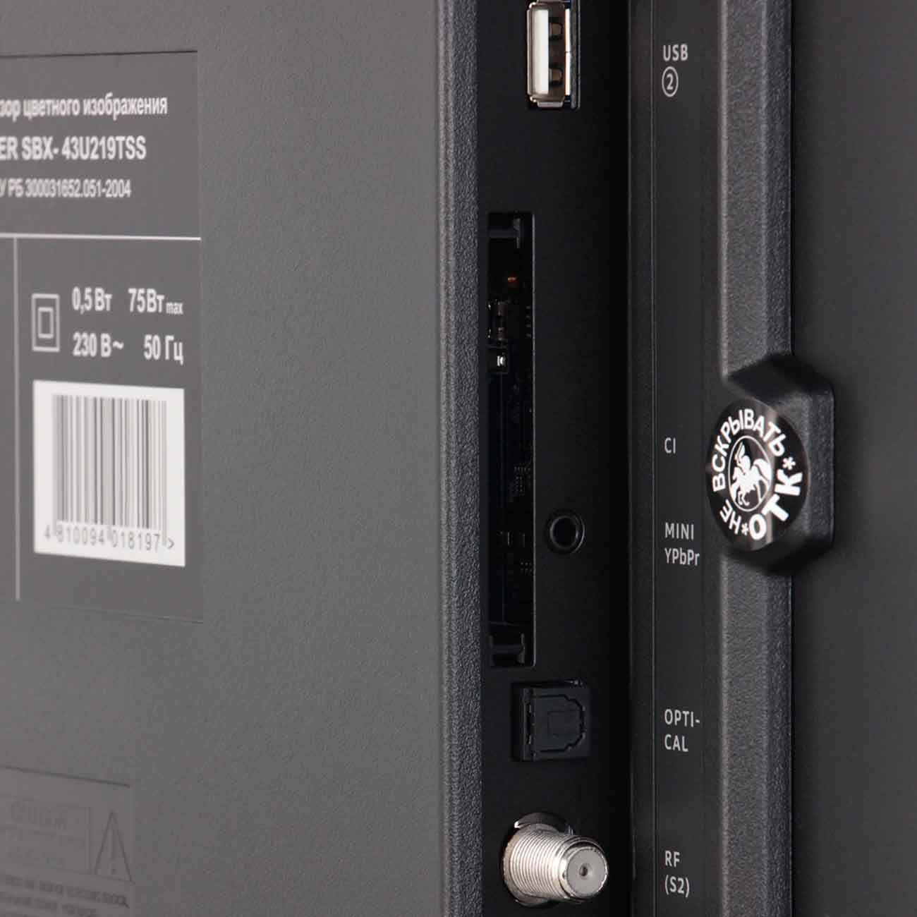 Телевизор Sber SBX-43U219TSS работает на операционной системе «Салют ТВ2». Он оснащен модулем Wi-Fi и открывает доступ к множеству фильмов, сериалов и передач в интернете. Для геймеров предусмотрен облачный сервис SberPlay, позволяющий знакомиться с требовательными играми.
