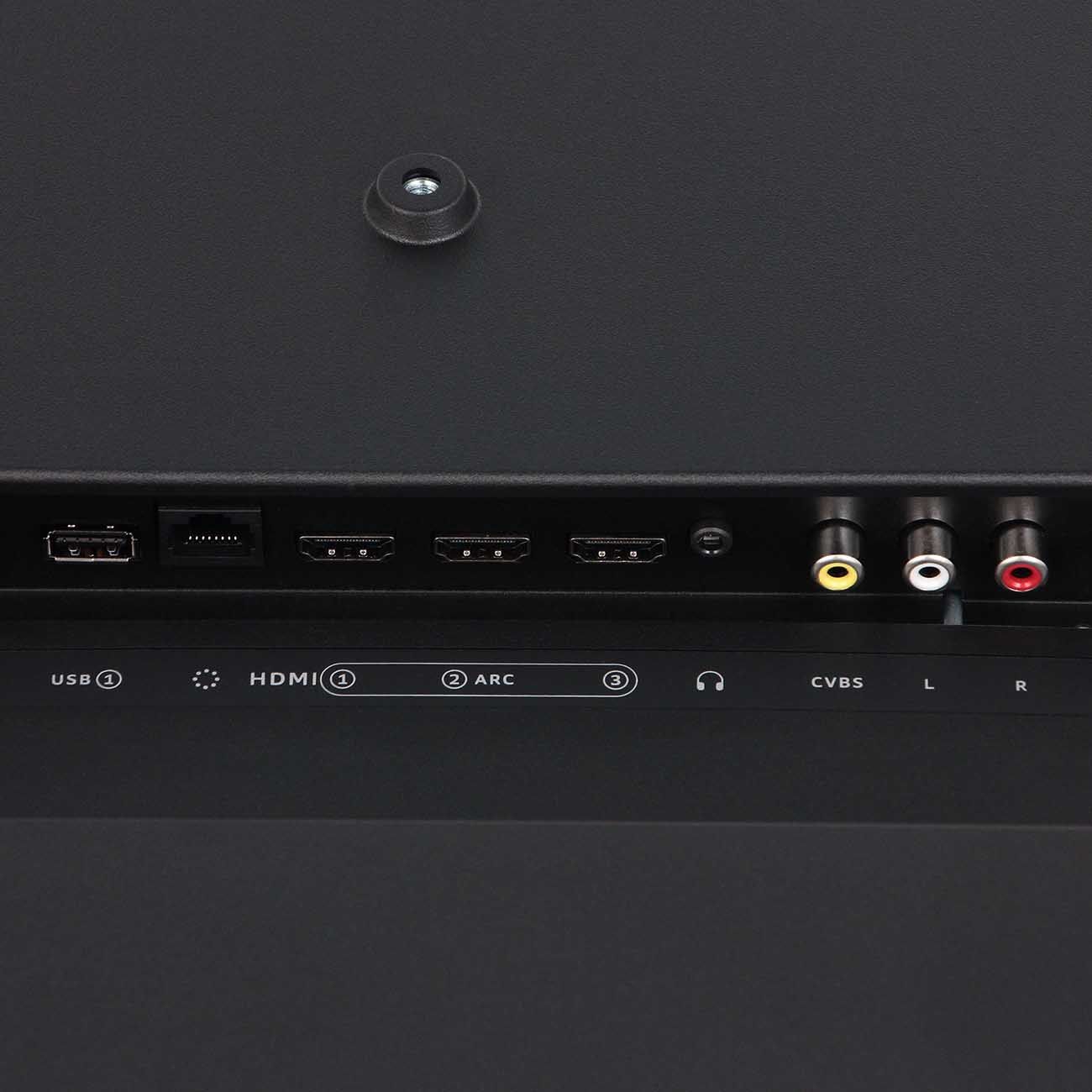 Разрешение экрана 3840 х 2160 пикселей обеспечивает высокую четкость изображения. Картинка — яркая и реалистичная. Акустическая система с технологией Dolby Digital Plus воспроизводит громкий и естественный звук. На корпусе есть разъемы USB и HDMI для подключения внешних устройств.