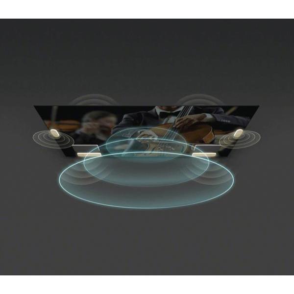 Акустическая система телевизора представлена двумя высокочастотными, двумя низкочастотными динамиками и двумя сабвуферами общей мощностью 60 Вт. Встроенные цифровые и аналоговые тюнеры обеспечивают доступ к ТВ телеканалам без подключения источника сигнала. На коммутационной площадке расположены интерфейсы HDMI (четыре), USB 2,0 Type-A (два), RJ45, разъем для модуля DVB CAM. Функции Chromecast и AirPlay обеспечивают беспроводную трансляцию мультимедийного контента с мобильных устройств, планшета или ПК на большой экран.