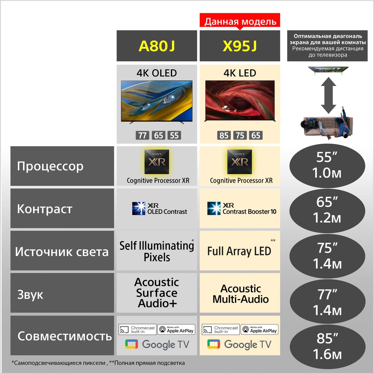 Телевизор Sony XR85X95J оснащён интеллектуальным процессором Cognitive Processor XR. Он работает подобно человеческому мозгу: одновременно проводит перекрёстный анализ сразу нескольких сотен тысяч элементов (цвет, детализация, контрастность и другие), чтобы оптимизировать параметры изображения.