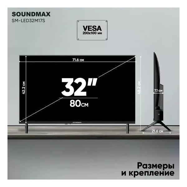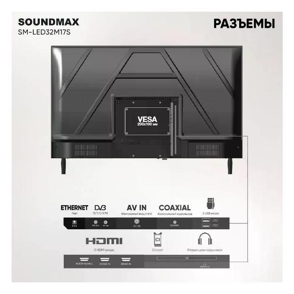 Вы можете купить Телевизор Soundmax SM-LED32M17S в магазинах М.Видео по доступной цене. Телевизор Soundmax SM-LED32M17S: подробное описание, фото и отзывы реальных покупателей, характеристики, возможность скачать инструкции и подобрать аксессуары.