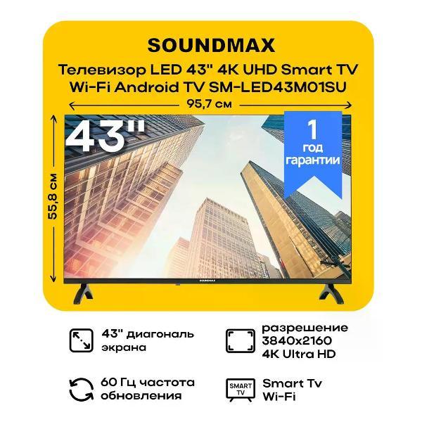 Вы можете купить Телевизор Soundmax SM-LED43M01SU в магазинах М.Видео по доступной цене. Телевизор Soundmax SM-LED43M01SU: подробное описание, фото и отзывы реальных покупателей, характеристики, возможность скачать инструкции и подобрать аксессуары.