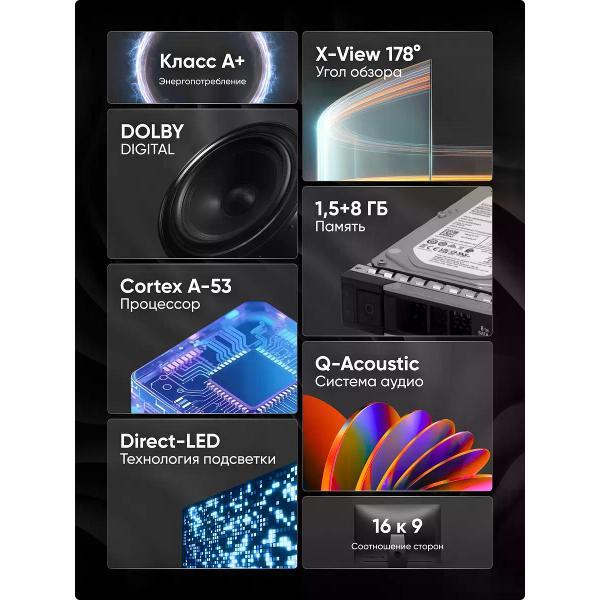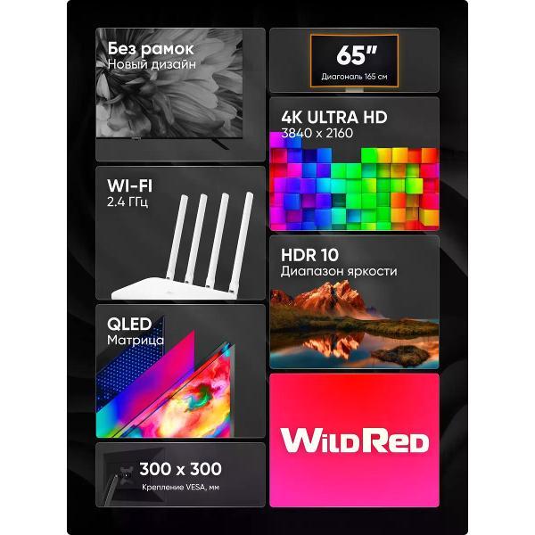 Телевизор диагональю 65 дюймов(165см) – это современное решение для дома, которое сочетает качество изображения на большом экране, удобный функционал и универсальность. Ультратонкие рамки и стильный дизайн легко впишутся в любой интерьер.Модель оснащена QLED-панелью формата 16:9 и разрешением 4K (3840х2160)пикселей. Благодаря технологии QLED экран передает более живые цвета, делая картинку яркой и реалистичной без потери насыщенности и размытия деталей.Частота обновления составляет 60 Гц, что делает изменение картинки более плавным и подходит для просмотра фильмов, сериалов, спортивных трансляций и игр. Стерео-звук с технологией Dolby Digital мощностью 16 Вт позволяет погрузиться в происходящее на экране. Цифровой тюнер поддерживает стандарты DVB T/T2/C/S/S2. Smart TV открывает доступ к онлайн-кинотеатрам и другим сервисам, а встроенный Wi-Fi позволяет подключаться к интернету без проводов. При помощи модуля Bluetooth к устройству можно наушники, саундбар или другу акустику. Такой телевизор станет надёжным выбором для тех, кто ценит удобство, функциональность и высокое качество изображения.
