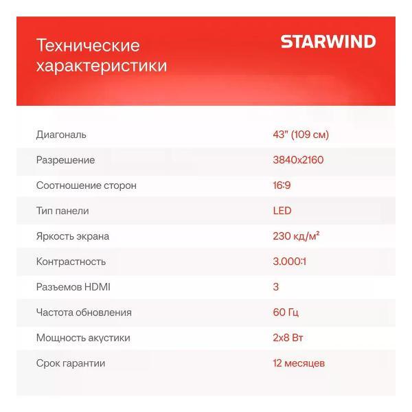 Вы можете купить Телевизор Starwind SW-LED43UG403 в магазинах М.Видео по доступной цене. Телевизор Starwind SW-LED43UG403: подробное описание, фото и отзывы реальных покупателей, характеристики, возможность скачать инструкции и подобрать аксессуары.