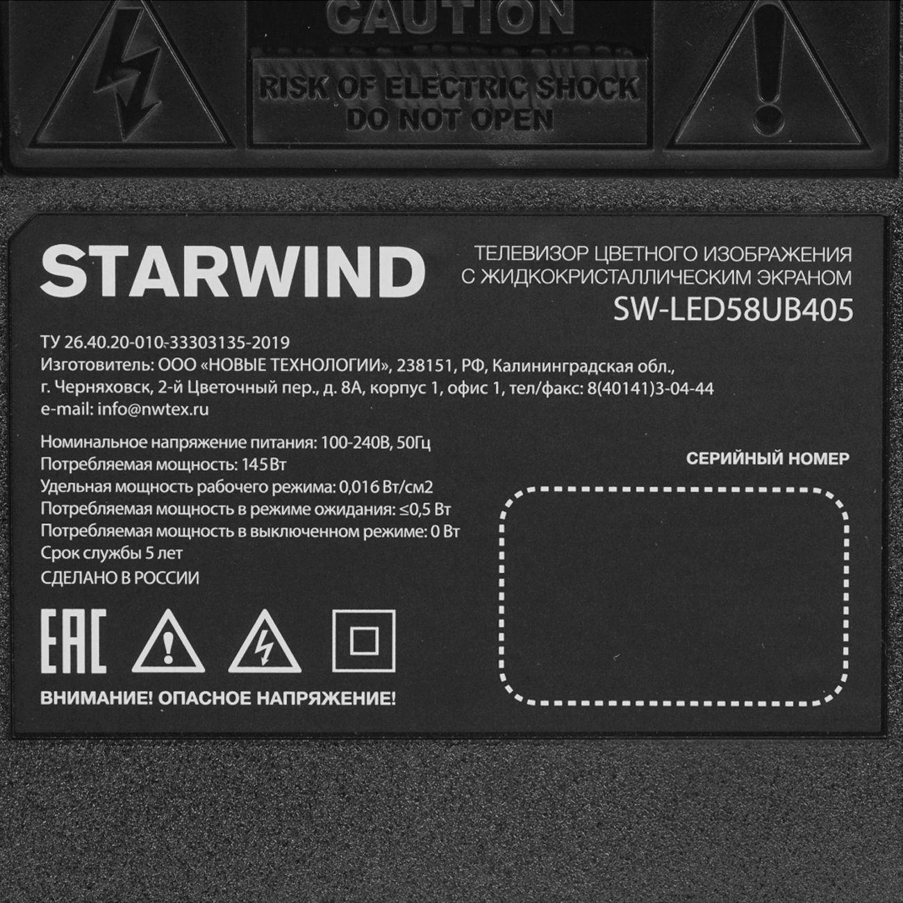 Starwind SW-LED58UB405 — телевизор с поддержкой Smart TV, операционной системой «Салют ТВ» и виртуальным ассистентом «Салют». Диагональ его LED-экрана составляет 58 дюймов, разрешение — 3840 х 2160 пикселей. Суммарная мощность акустической системы — 16 Вт.