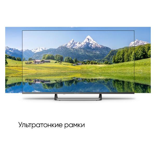 Устройство с ультратонким дисплеем диагональю 50" выполнено в безрамочном корпусе черного цвета. Экран формата 16:9 с VA-матрицей обеспечивает Ultra HD изображение. Частота обновления 60 Гц и технология HDR 10 гарантируют плавность динамических сцен, детализированность и насыщенность картинки. Конструкция с креплением VESA 200х200 устанавливается настенным способом — кронштейн приобретается отдельно. В комплектацию входит подставка для настольного размещения, с учетом которой габариты равны 69х111,1х23 см. Изделие размером 64,3х111,1х7,5 см весит 9,1 кг.