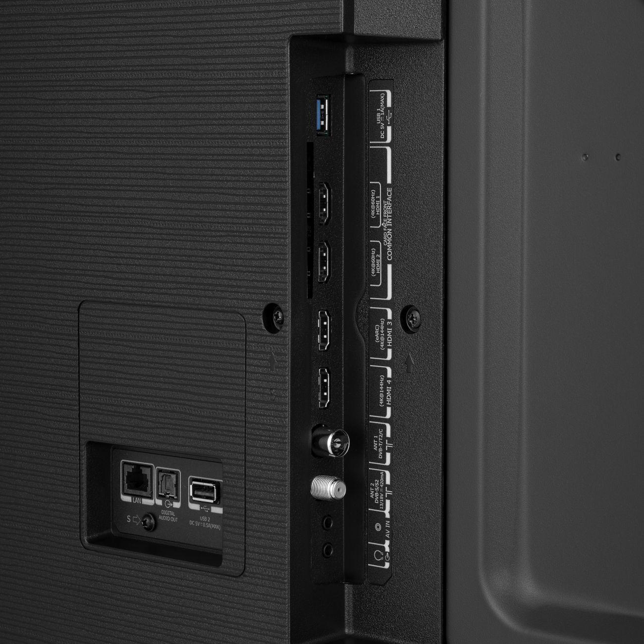 Соотношение сторон 16:9 — оптимально для просмотра широкоформатных фильмов без черных полос. Матовое покрытие предотвращает появление бликов и снижает нагрузку на глаза. Телевизор поддерживает функции Smart TV, голосовое управление (помощник «Салют»), беспроводное воспроизведение через модули Bluetooth и Wi-Fi, заложена функция «Картина». Модель интегрируется в экосистему умного дома «Сбер». Корпус совместим с креплением VESA 300х400 мм. Предусмотрены четыре входа HDMI 2.1, два порта USB Type-A, оптический выход, разъемы для наушников и LAN, слот для подключения CAM-модуля.